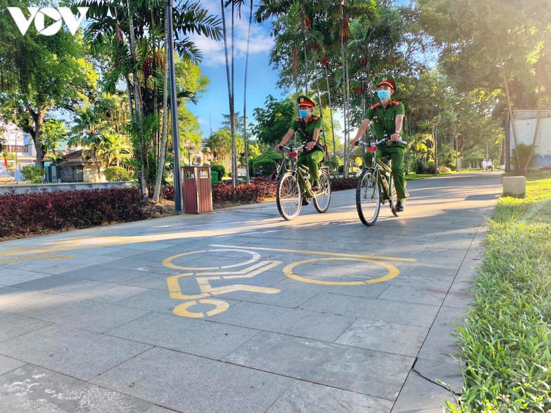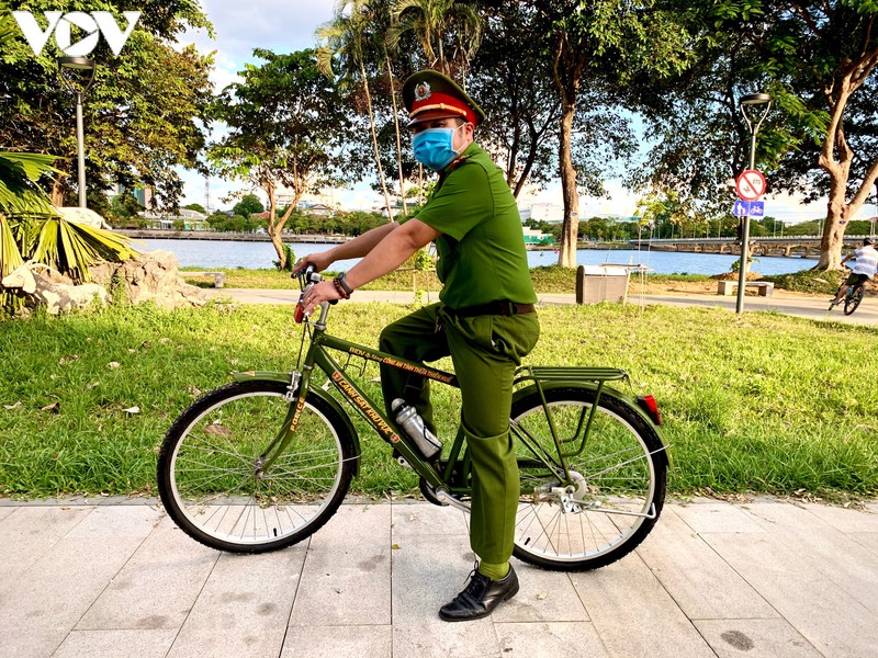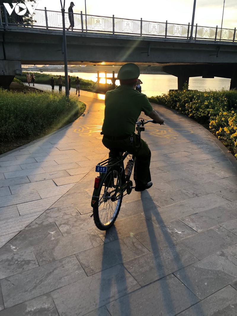 | Lực lượng Công an phường sử dụng xe đạp để tuần trên đường đi bộ ven Sông Hương. |