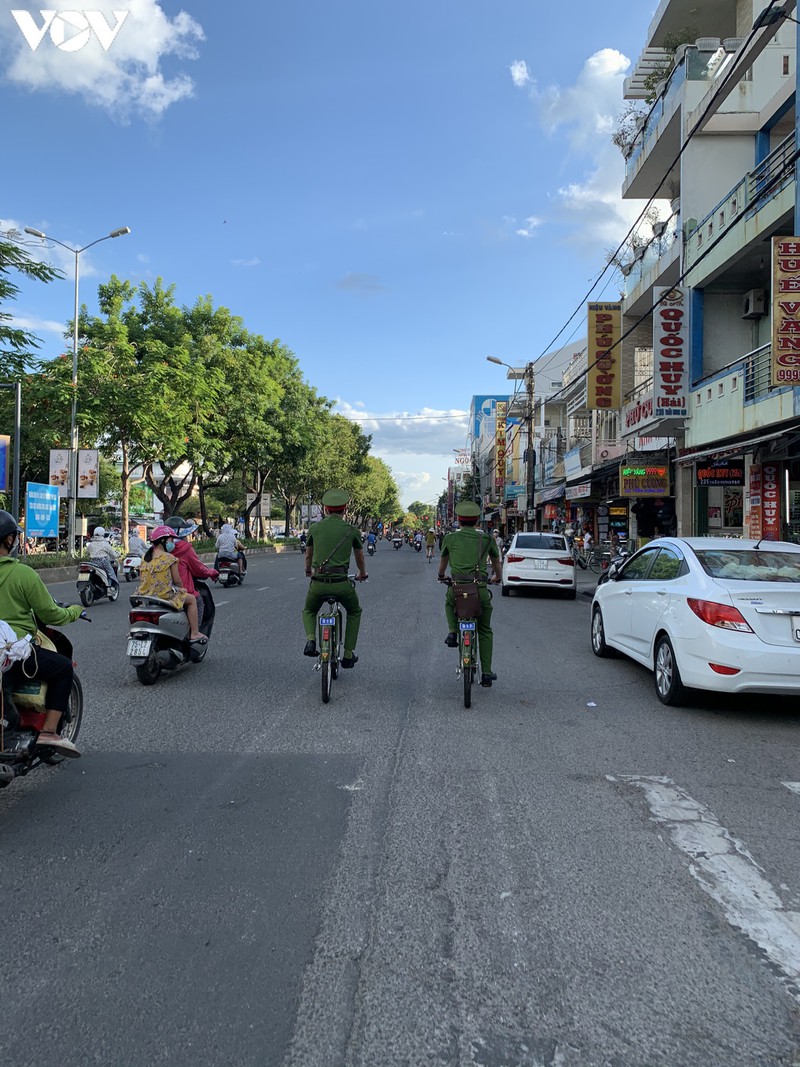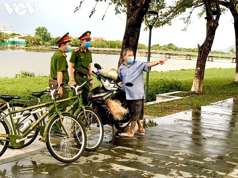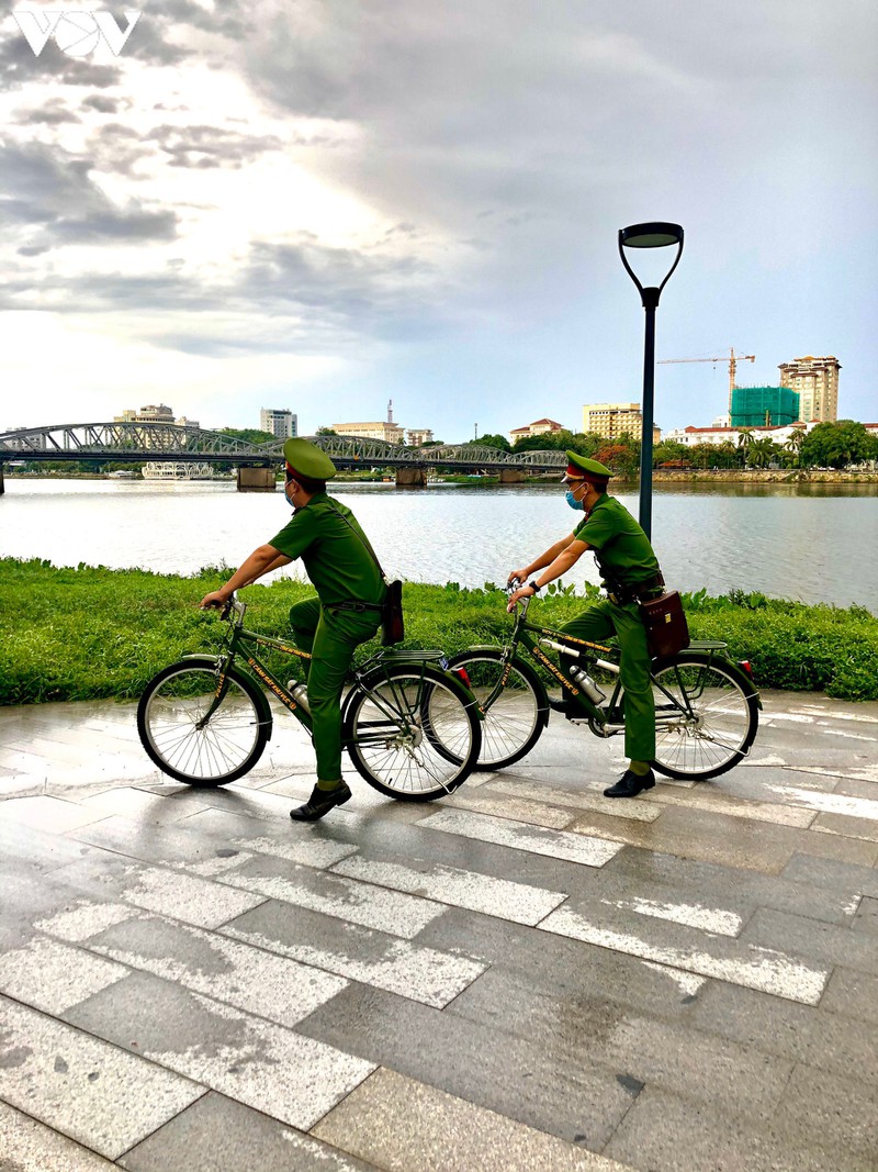 | Hình ảnh đẹp của chiến sĩ công an Huế khi đạp xe tuần tra phòng, chống Covid-19./. |