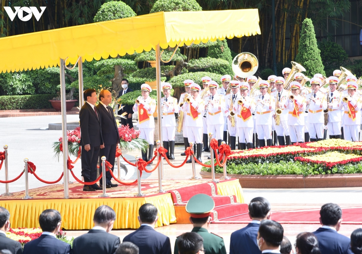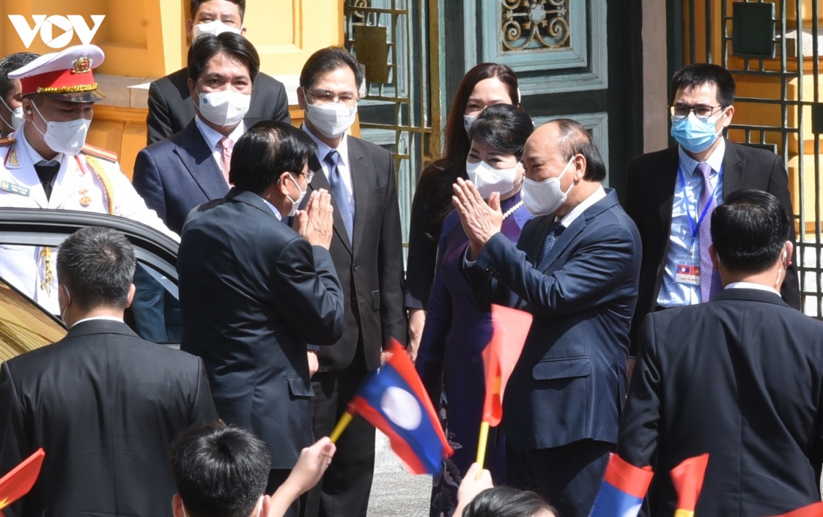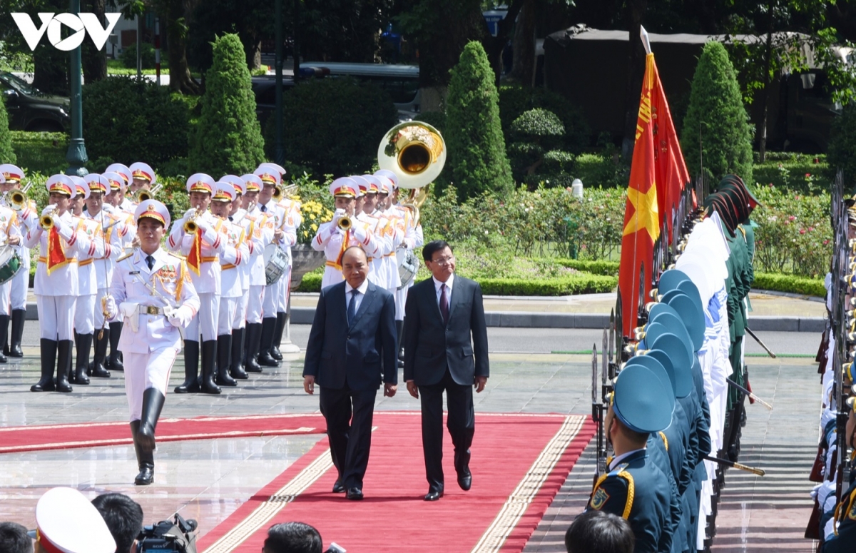 Chủ tịch nước Nguyễn Xuân Phúc mời Tổng Bí thư, Chủ tịch nước Lào duyệt Đội Danh dự Quân đội Nhân dân Việt Nam.