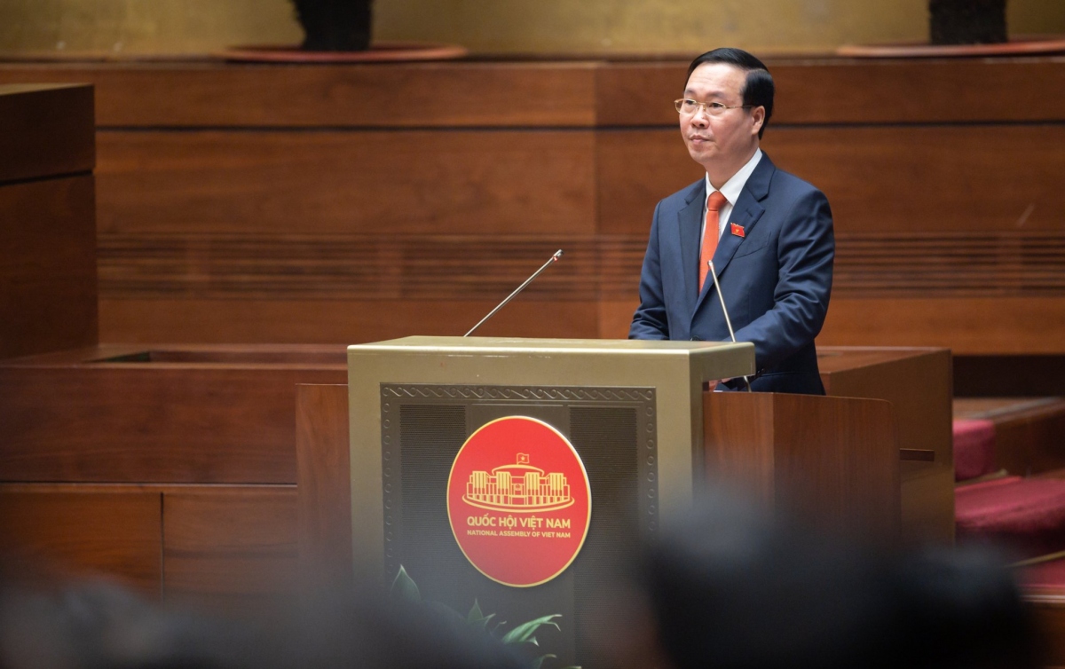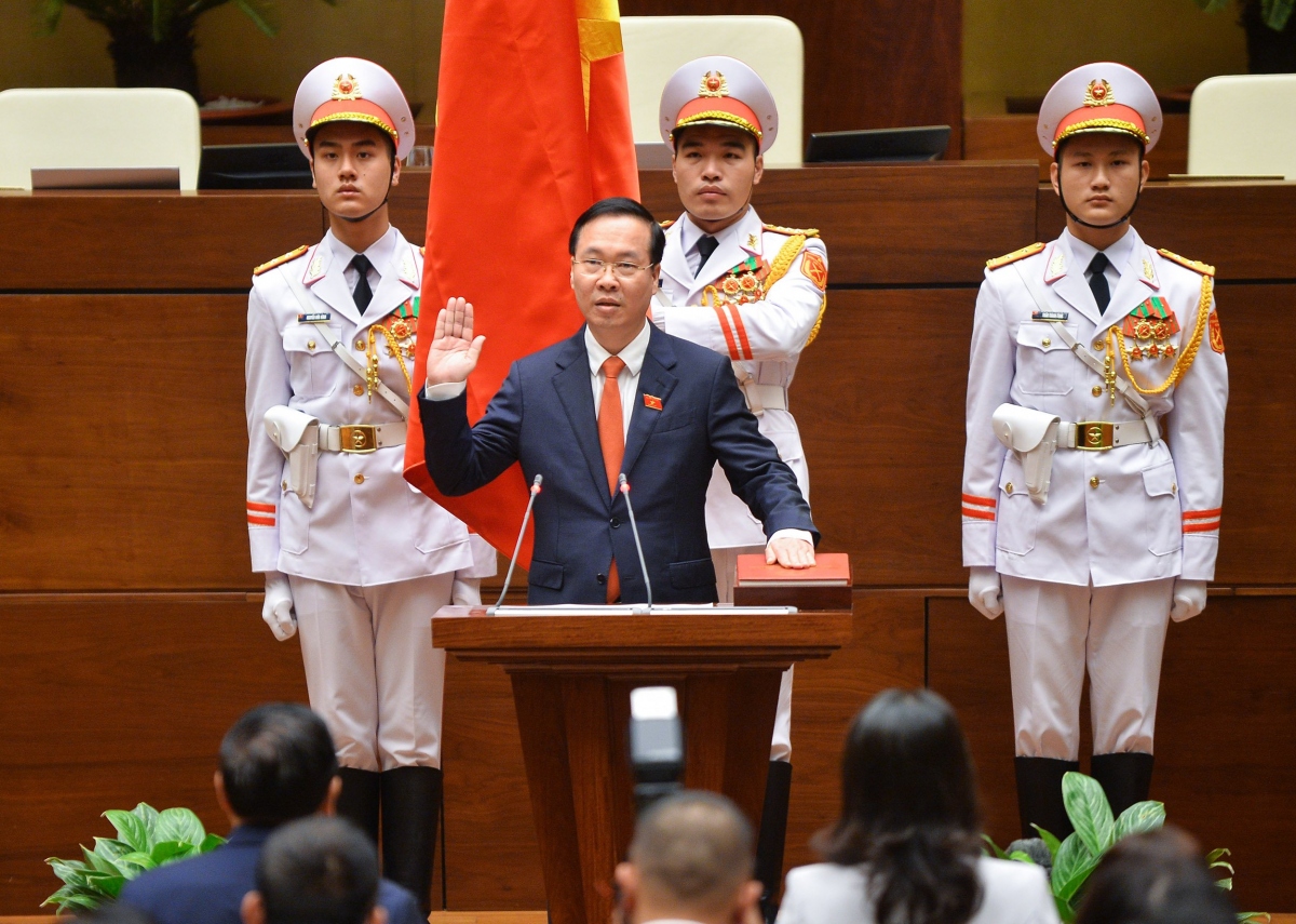 “Dưới cờ đỏ sao vàng thiêng liêng của Tổ quốc, trước Quốc hội và đồng bào cử tri cả nước, tôi – Chủ tịch nước CHXHCN Việt Nam xin tuyên thệ: Tuyệt đối trung thành với Tổ quốc, với Nhân dân, với Hiến pháp nước CHXHCN Việt Nam; Nỗ lực công tác để hoàn thành tốt nhiệm vụ được Đảng, Nhà nước và Nhân dân giao phó” - Chủ tịch nước Võ Văn Thưởng tuyên thệ. |