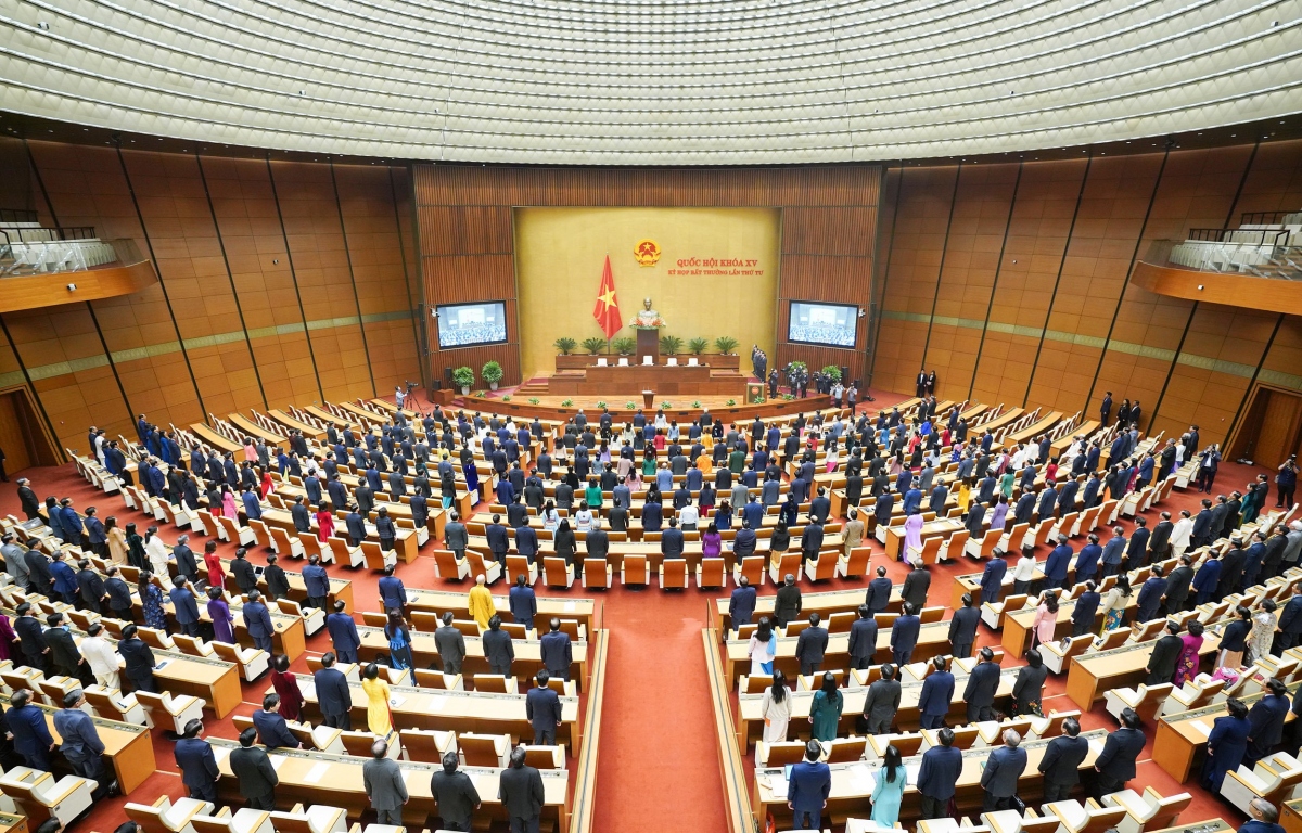 Chủ tịch nước Võ Văn Thưởng cúi chào Quốc kỳ trước khi tuyên thệ trước Quốc hội tại Kỳ họp bất thường lần thứ 4, tại Nhà Quốc hội, Hà Nội. |