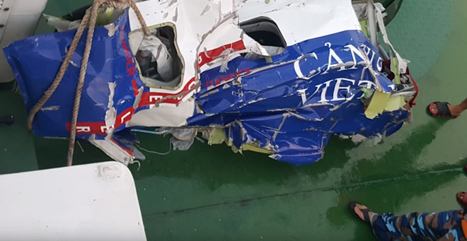 | Các mảnh vỡ của máy bay CASA số hiệu 8983 của Cảnh sát biển Việt Nam vừa được trục vớt. |