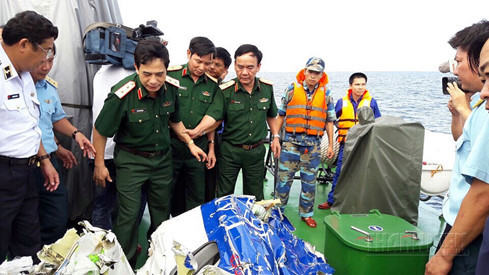 | Trung tướng Phan Văn Giang (thứ ba từ trái sang) quan sát mảnh vỡ của chiếc máy bay CASA-212 |