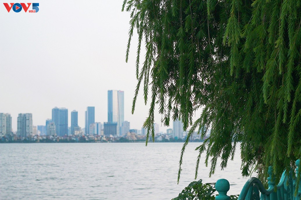 Những toà nhà cao tầng ẩn hiện sau rặng liễu. |