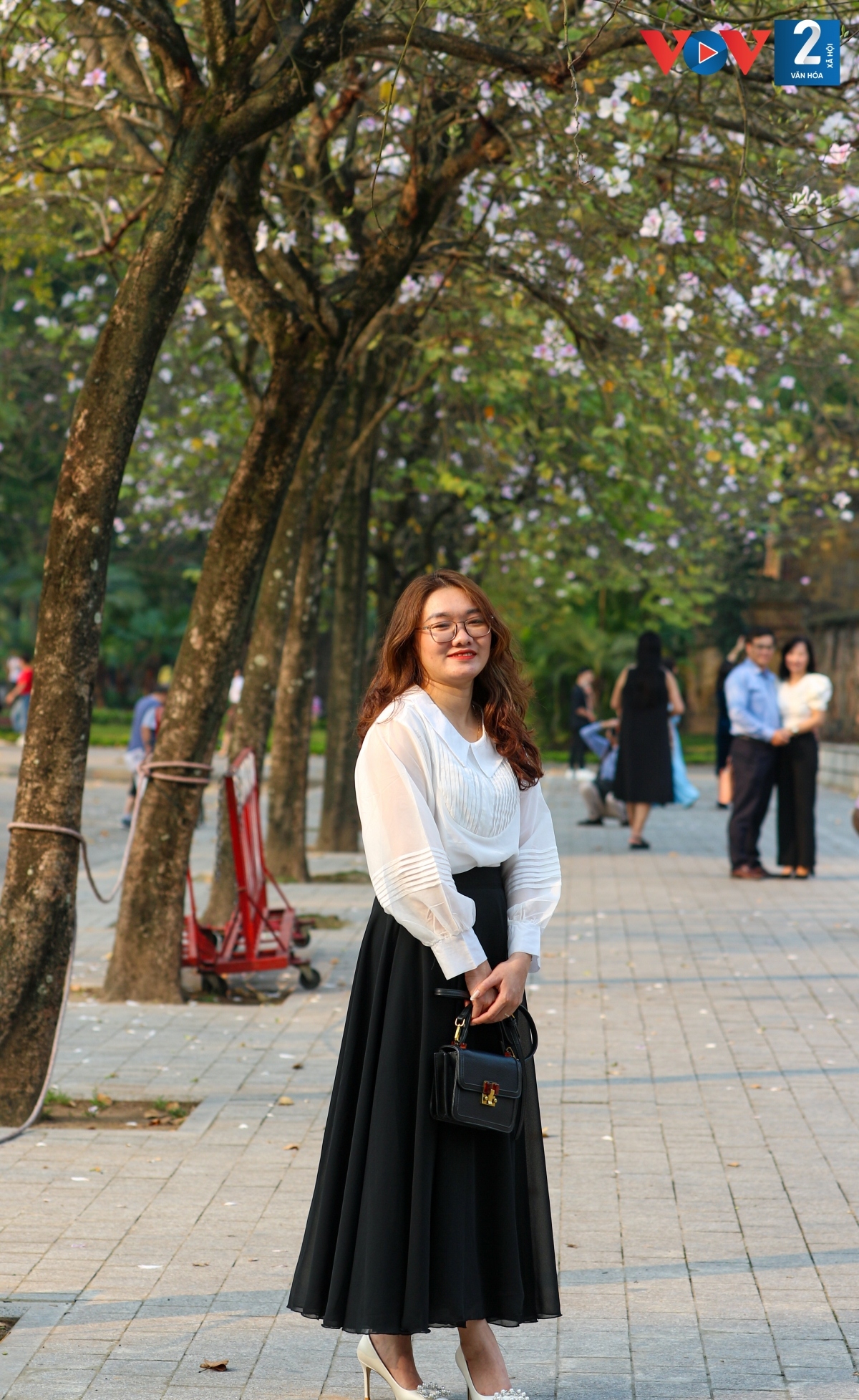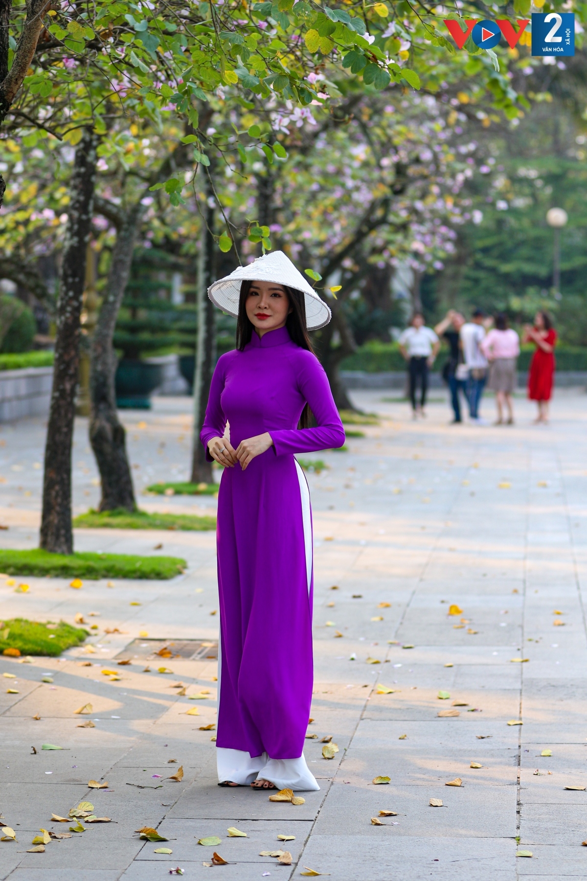 Tà áo dài truyền thống vẫn được nhiều chị em ưu tiên lựa chọn khi chụp ảnh cùng hoa ban. |