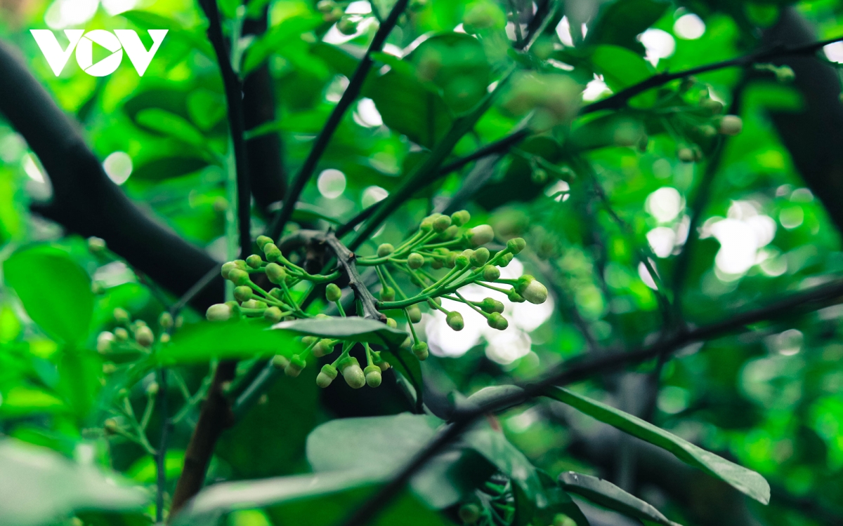 Những chùm hoa bưởi đầu mùa vẫn còn chúm chím.