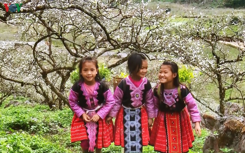Các em nhỏ người dân tộc trong trang phục sặc sỡ tô điểm thêm màu sắc cho thung lũng trắng.