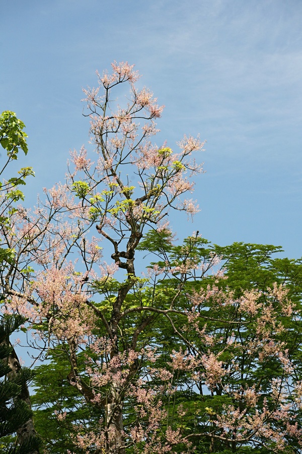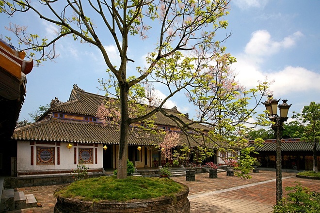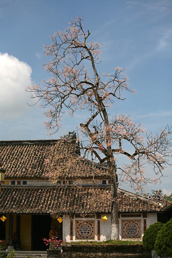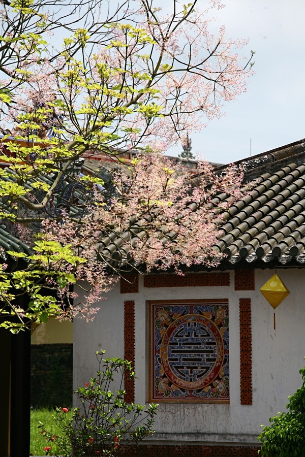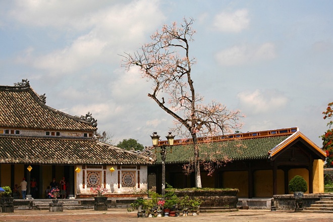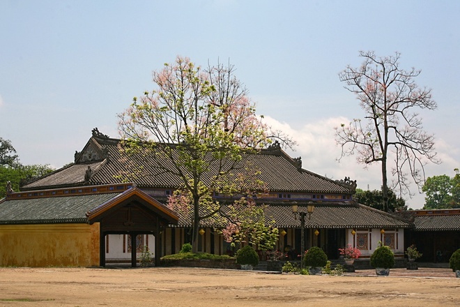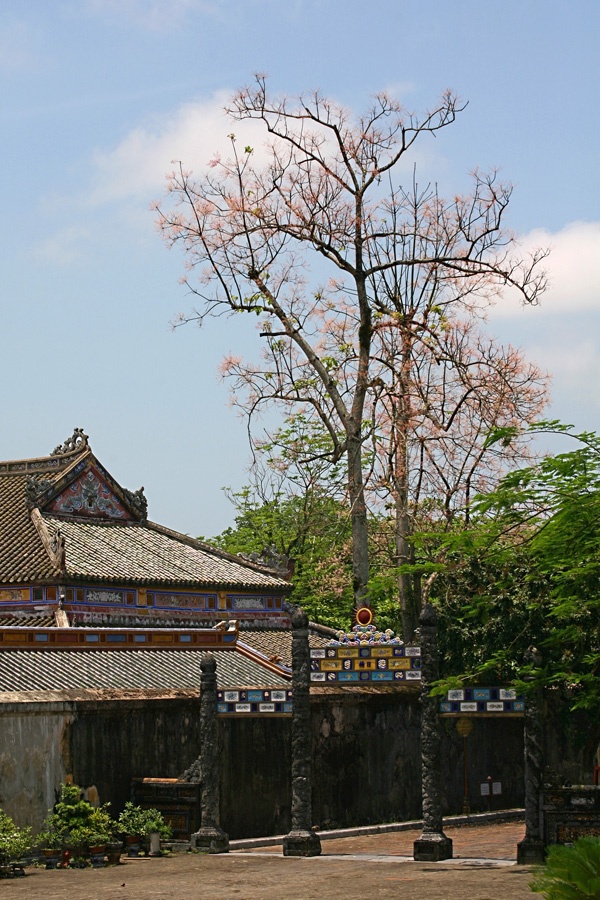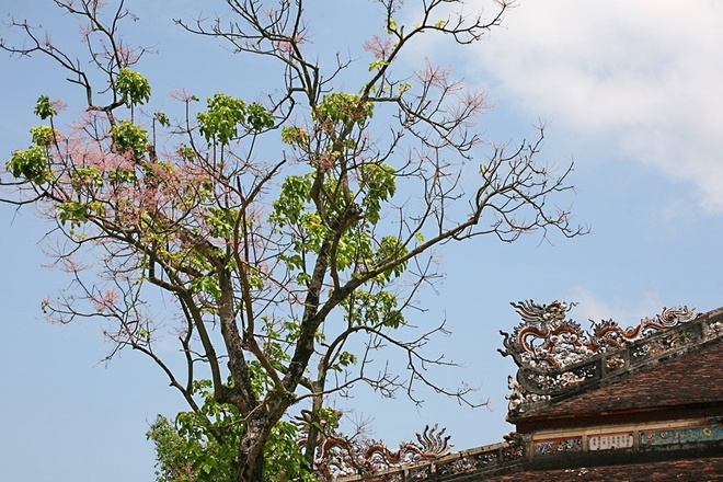 | Phía sau điện Thái Hoà có một cây ngô đồng, khi nở hoa tô điểm thêm sắc hồng thắm cho mái điện với rồng chầu. Những cây ngô đồng trong Đại Nội khi ra hoa tạo nên một sắc thái mới lạ, rực rỡ và quyến rũ cho những đền đài cung điện. |