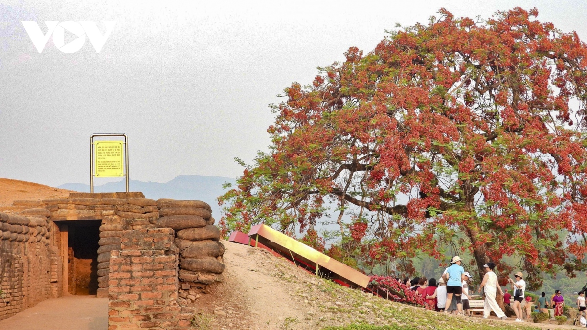 Hai cây hoa phượng nằm ngay gần khu vực đỉnh đồi và hố bộc phá, thường nở rực rỡ vào thời điểm đầu tháng 5, tô điểm cho cụm di tích này. |