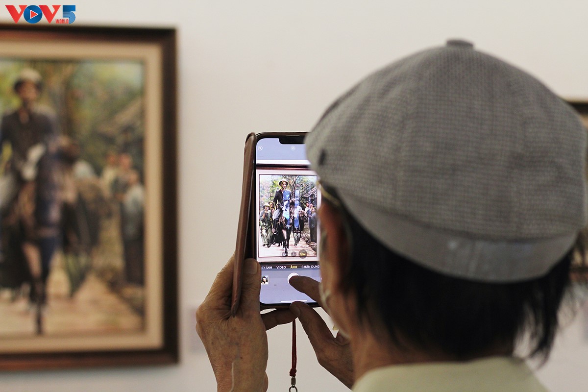 Một người dân hân hoan chụp ảnh bên những tác phẩm về Bác Hồ. |