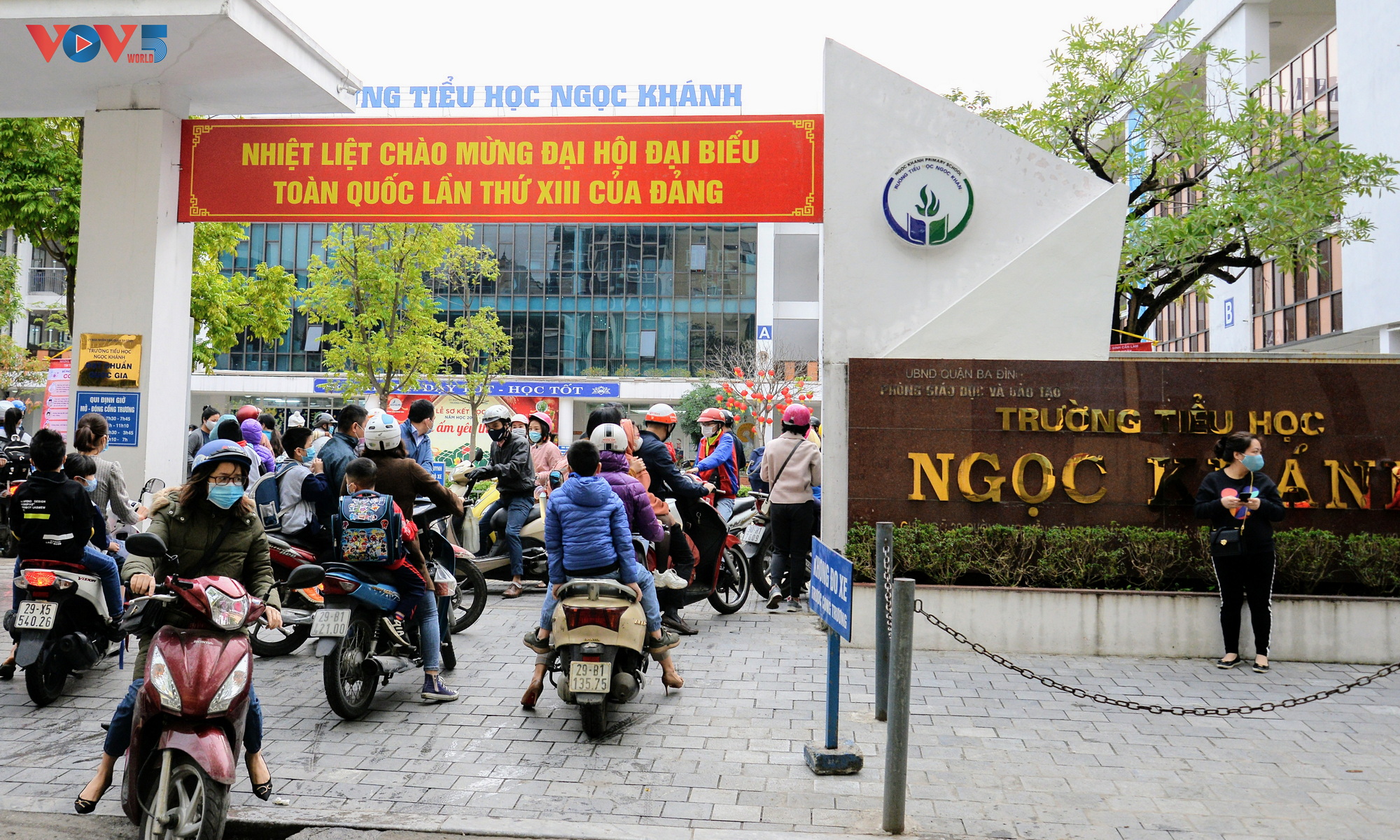 | Tại trường Tiếu học Ngọc Khánh, các phụ huynh đưa con tới lớp dừng xe trong khu vực quy định ở sân trường để các con tiến hành kiểm tra thân nhiệt và sát khuẩn trước khi vào lớp. |