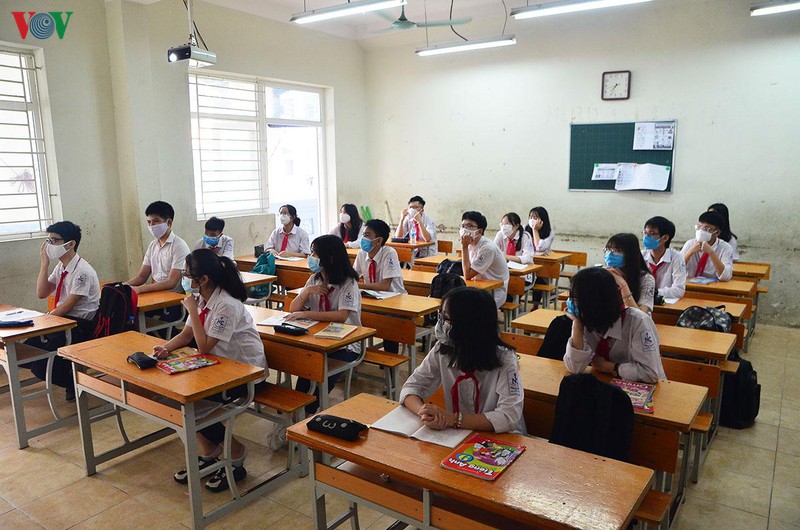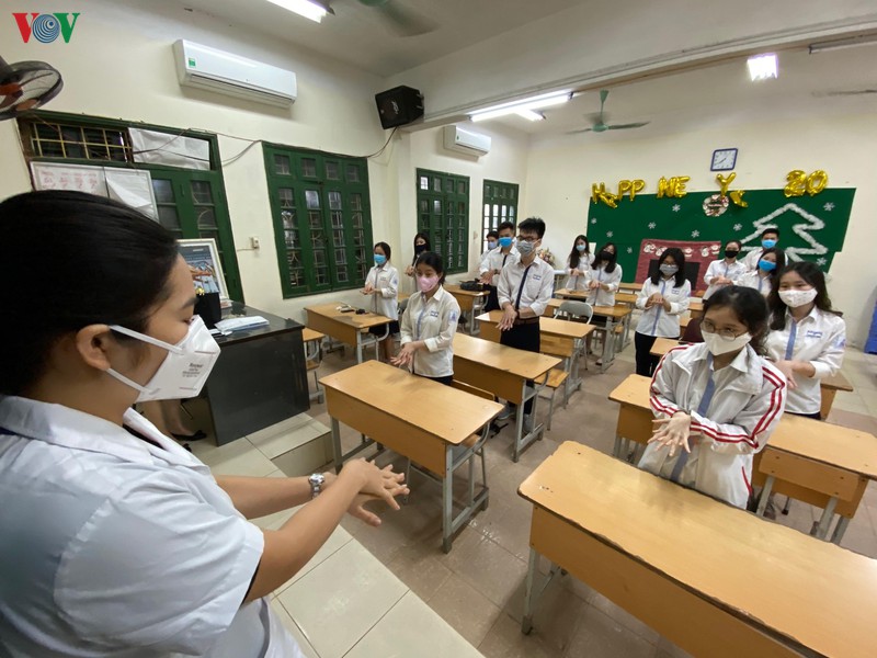 Cô Nguyễn Bội Quỳnh, Hiệu trưởng trường THPT Việt Đức cho biết, để đảm bảo an toàn cho học sinh khi đi học trở lại, trường đã tiến hành làm vệ sinh, khử khuẩn toàn bộ khuôn viên, lớp học, tiến hành đo thân nhiệt để kiểm soát tình trạng sức khỏe của học sinh. Học sinh khối lớp 12 được ưu tiên học buổi sáng, riêng với khối lớp 10 và lớp 11 sẽ được học xen kẽ 3 buổi học trực tiếp tại trường kết hợp với 3 buổi học online tại nhà để đảm bảo đúng yêu cầu giãn cách trong lớp học.