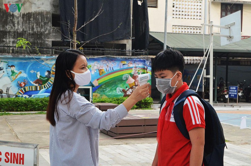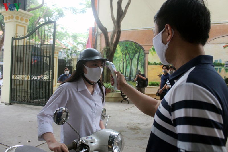Học sinh trường THPT Phan Đình Phùng (Ba Đình, Hà Nội) đo thân nhiệt trước khi vào trường.