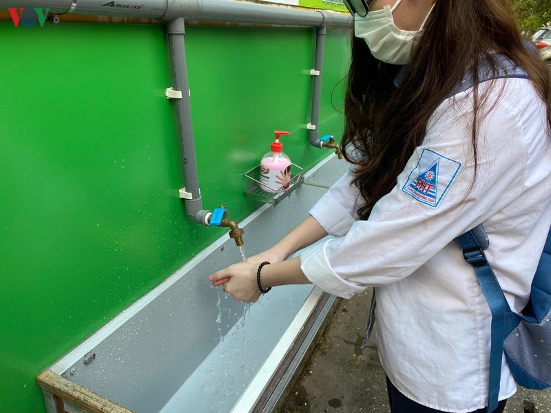 Trường THPT Phạm Hồng Thái (Ba Đình, Hà Nội) bố trí các bồn rửa tay ngay trên sân trường cho học sinh.