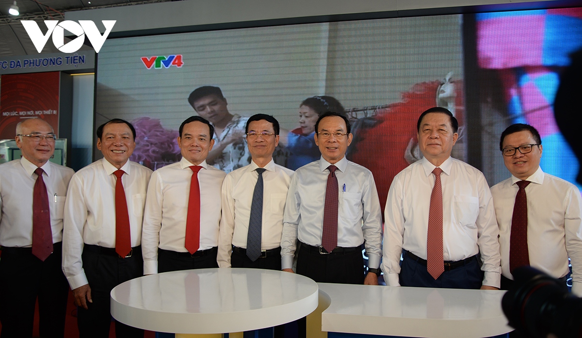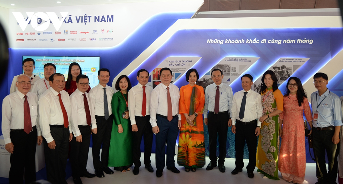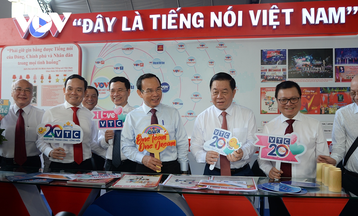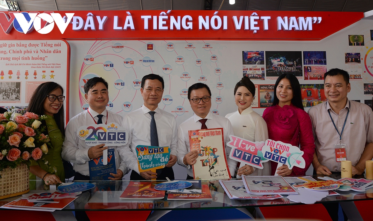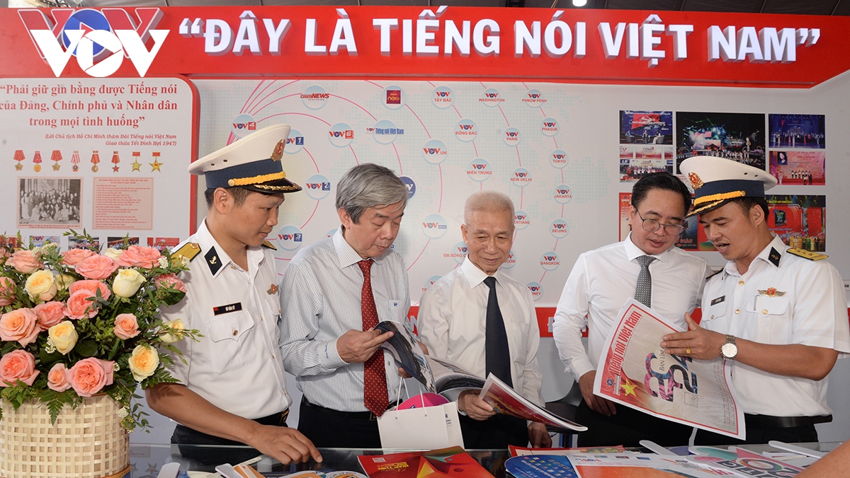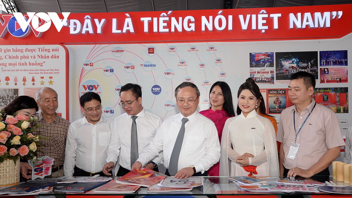 Chủ tịch Hội Nhà báo Việt Nam Lê Quốc Minh và Bộ trưởng Bộ Thông tin - Truyền thông Nguyễn Mạnh Hùng thăm gian trưng bày của VOV. |
