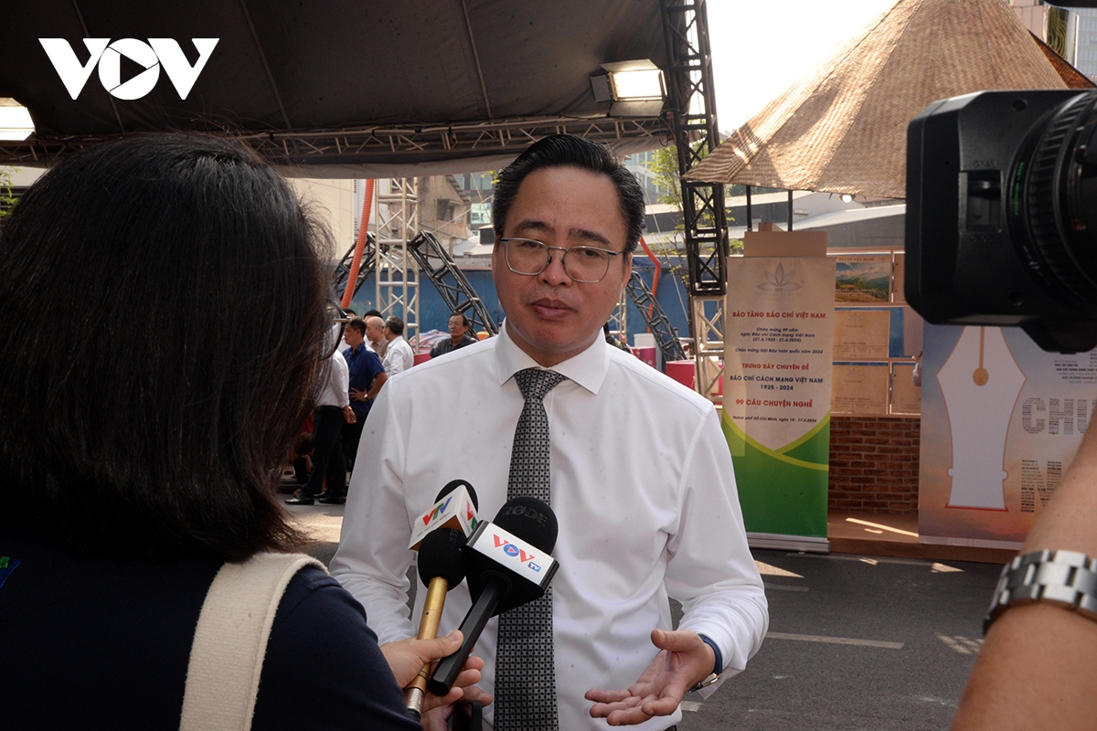 Phó Tổng Giám đốc VOV Phạm Mạnh Hùng trả lời phỏng vấn các cơ quan báo chí. |