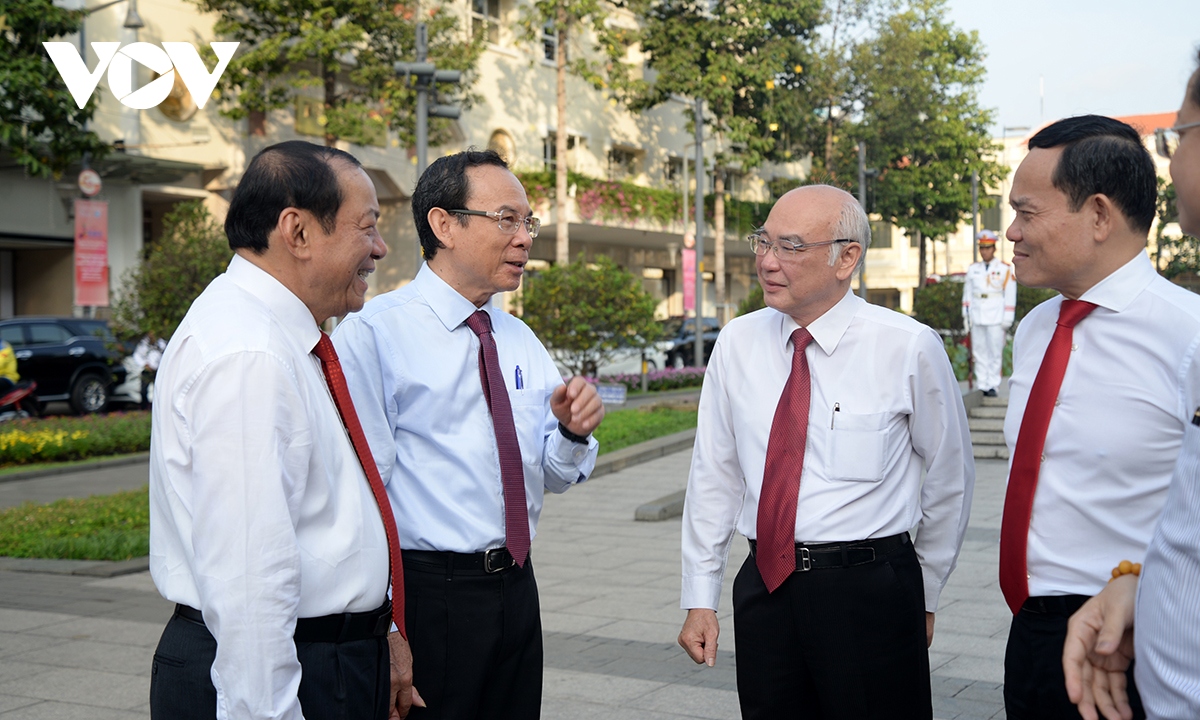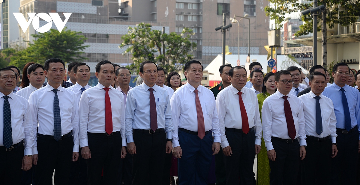 Lãnh đạo Đảng, Nhà nước dâng hương, dâng hoa tại tượng đài Bác Hồ trước khi dự lễ khai mạc. |