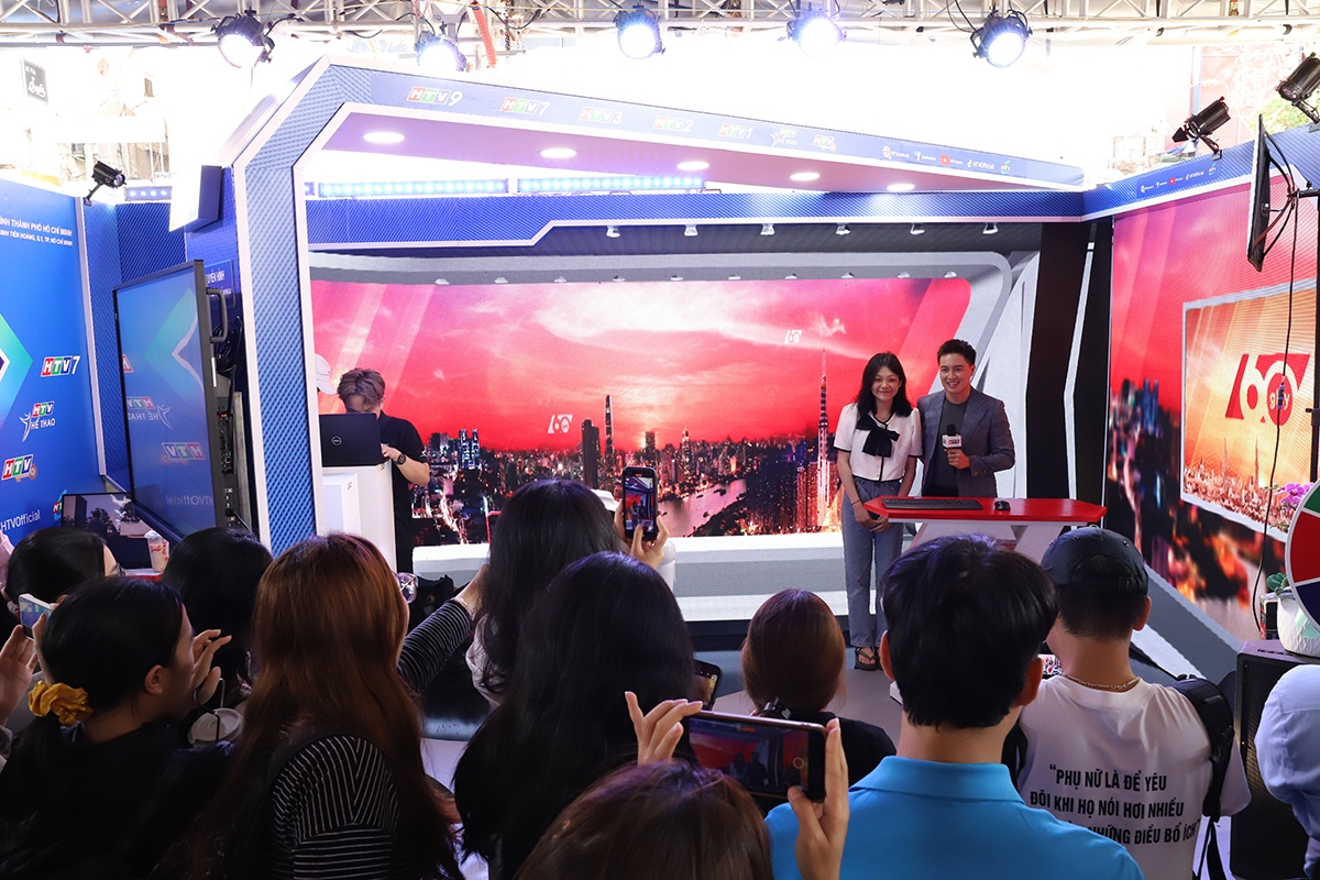 Hoạt động thử sức làm người dẫn chương trình bản tin 60 giây của HTV thu hút đông đảo các bạn trẻ tham gia. |