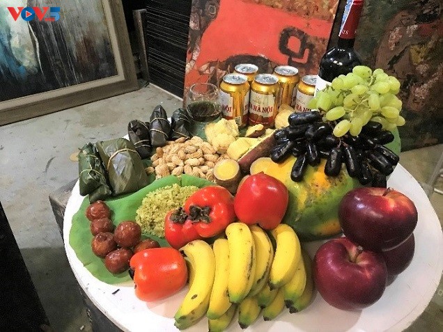 Ngay từ sáng sớm, hoạ sĩ Đoàn Hương đã chuẩn bị một mâm hoa quả, bánh trái mang đậm hương vị mùa thu tại không gian làm việc của mình để chuẩn bị cho buổi khai mạc online.