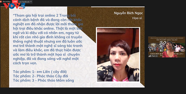Hoạ sĩ Bích Ngọc hiện đang sinh sống tại thành phố Hồ Chí Minh bày tỏ sự xúc động khi được tham gia chương trình: “Làm điêu khắc là ước mơ của tôi. Tôi có một mong mỏi là điêu khắc của Việt Nam được công chúng biết đến nhiều hơn. Dịch bệnh bùng phát và đảo lộn cuộc sống của tôi. Hội trại điêu khắc được tổ chức là niềm vui lớn đối với tôi, giúp tôi hoà nhập lại với cộng đồng để lại được đam mê sáng tạo”.