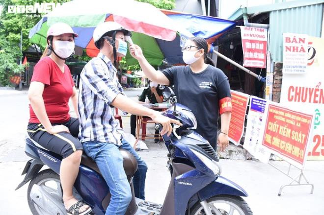 Tại chốt kiểm soát phòng, chống dịch Covid-19 thuộc tổ dân phố số 6, phường Nghĩa Xá (Lê Chân, TP Hải Phòng), một số người dân chưa ý thức đeo khẩu trang được các thành viên của chốt nhắc nhở và thực hiện đo thân nhiệt. |