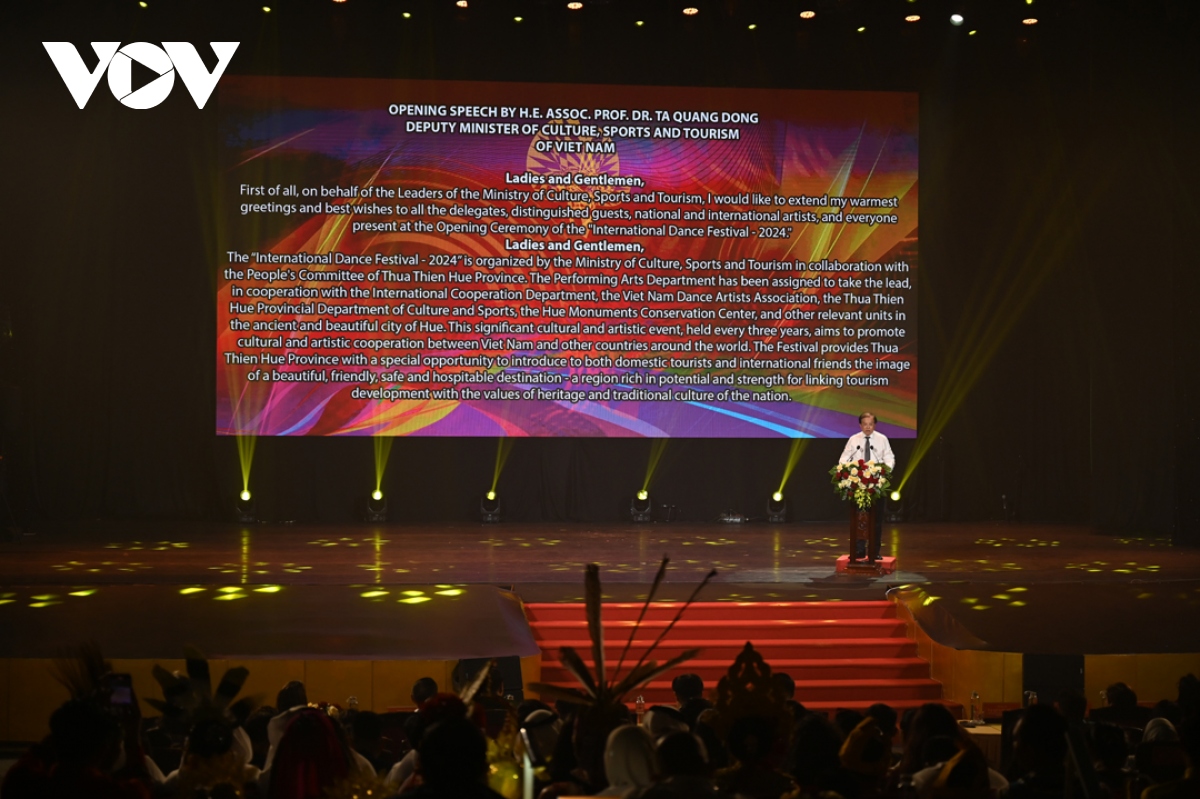| Phó Chủ tịch thường trực UBND tỉnh Thừa Thiên Huế Nguyễn Thanh Bình nhấn mạnh “Trong suốt thời gian diễn ra "Liên hoan Múa quốc tế - 2024", chúng tôi mong muốn các nghệ sĩ, diễn viên và toàn thể quý vị sẽ có những trải nghiệm thú vị, khám phá, tìm hiểu những giá trị văn hóa, di sản độc đáo, mang đậm bản sắc văn hóa Việt Nam, văn hóa Huế và lưu lại những kỷ niệm đẹp về một vùng đất và con người nghĩa tình, thân thiện, mến khách”. Ngay sau chương trình khai mạc là phần biểu diễn của Nhà hát Nhạc Vũ Kịch Việt Nam và đơn vị nghệ thuật đại diện cho Malaysia. |