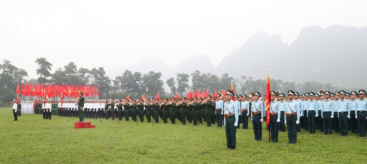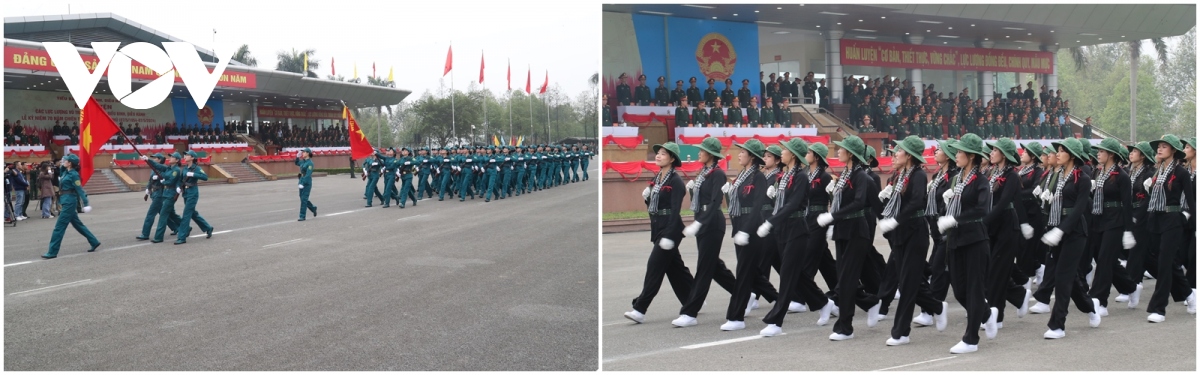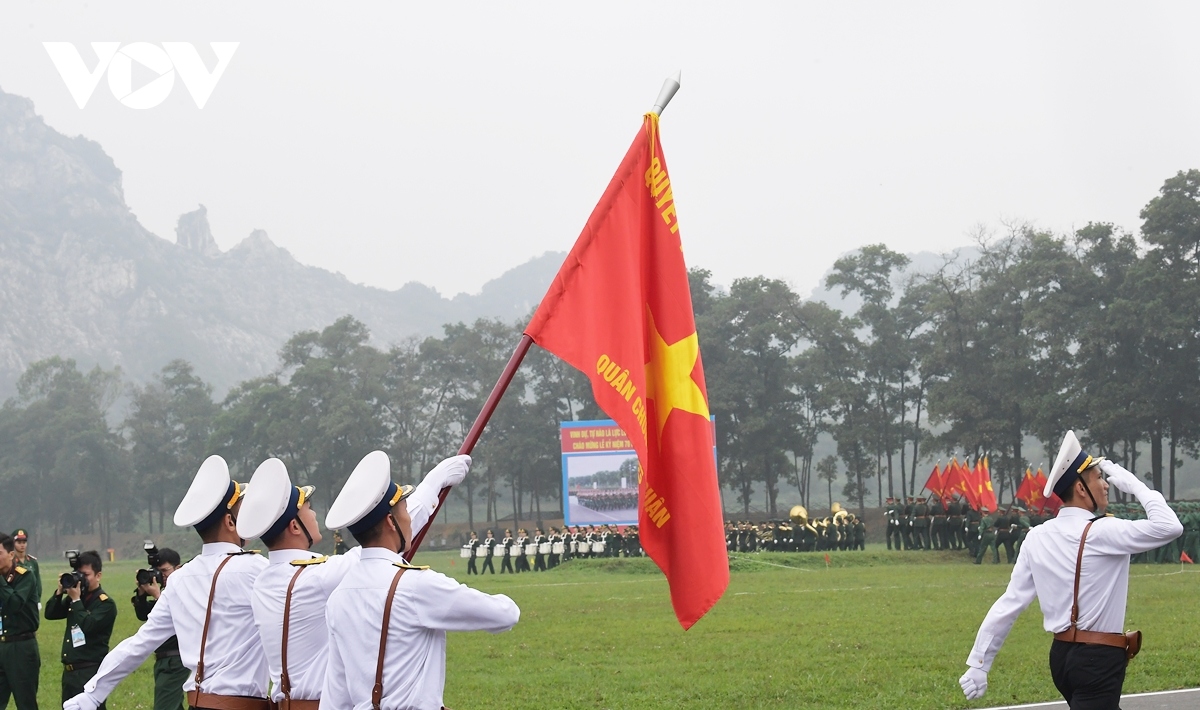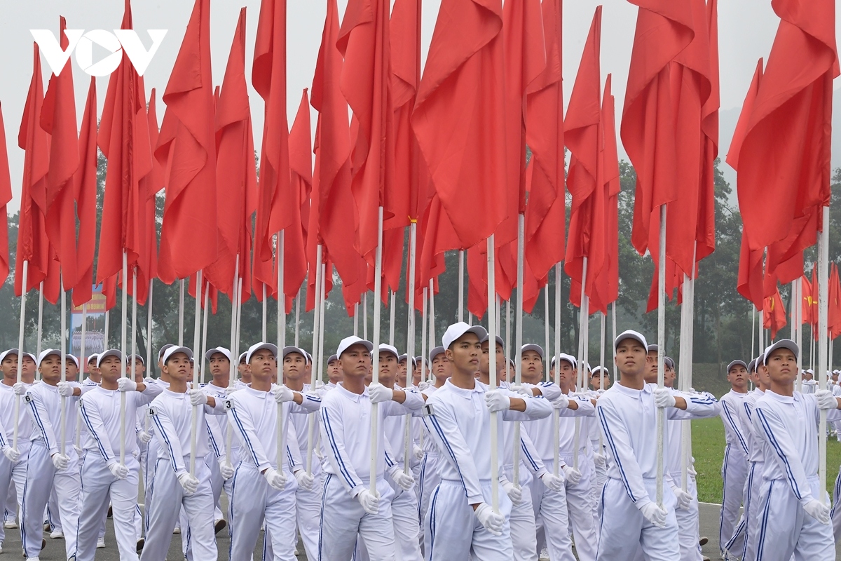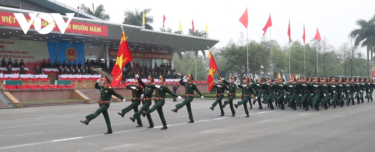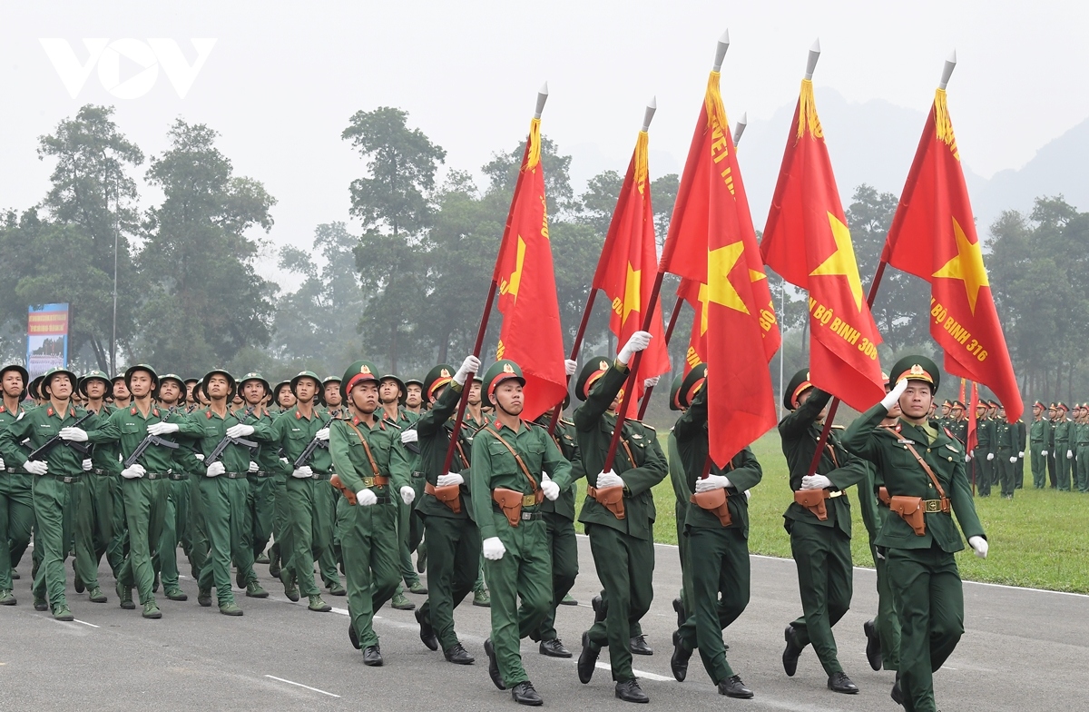 ...gồm các Đại đoàn 308 - Quân Tiên phong; 312 - Chiến thắng; 316 - Bông Lau; Đại đoàn Công Pháo 351 tiến vào lễ đài. |