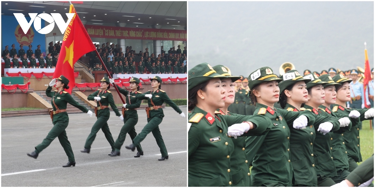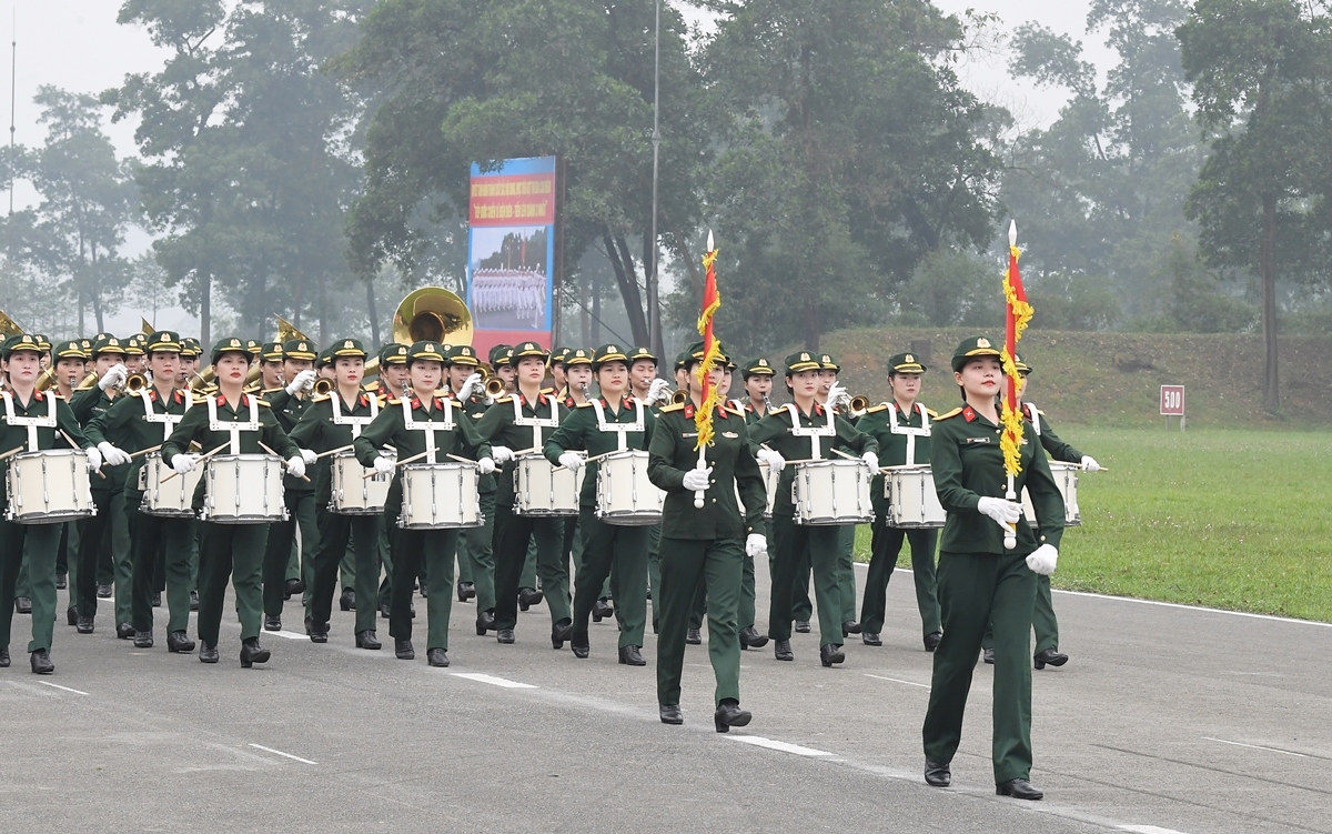 Khối nữ Quân nhạc Việt Nam cùng những âm thanh hùng tráng, ngân vang trong lễ diễu binh. |