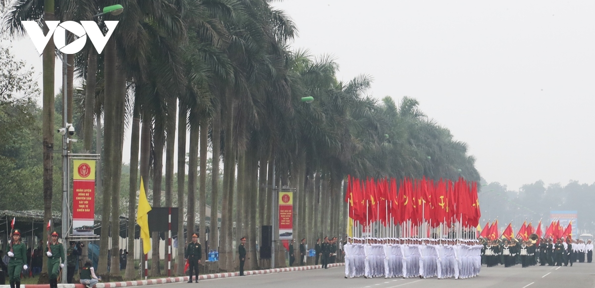 Khối cờ Đảng, Cờ Tổ quốc, cùng khối quân kỳ dẫn đầu đội hình các khối đại điện cho lực lượng vũ trang tiến vào lễ đài. |