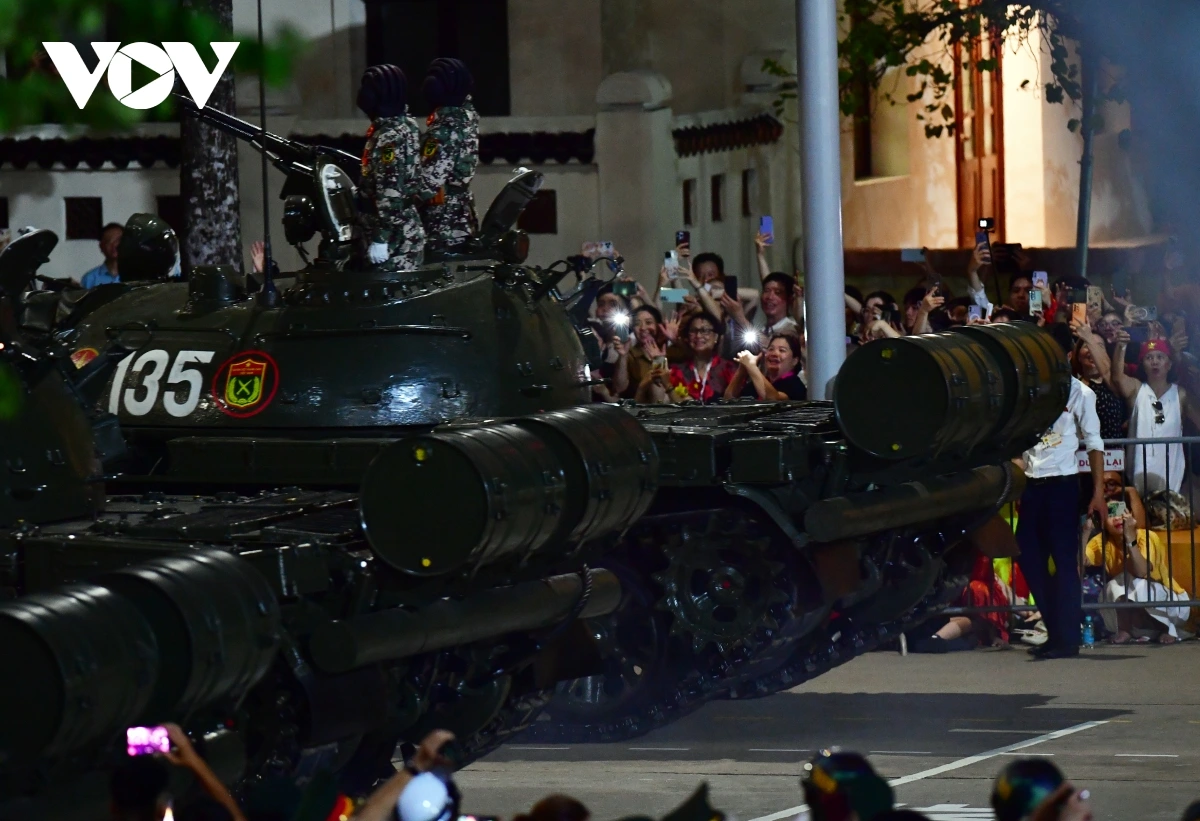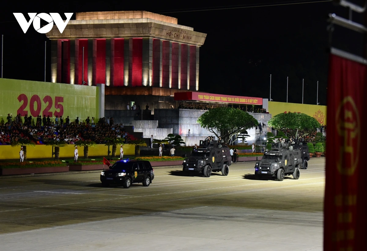 | Sau khi các khối đi bộ và khối Cảnh sát cơ động kỵ binh tiến qua lễ đài, các khối xe pháo quân sự, xe đặc chủng xuất hiện trên Quảng trường Ba Đình. |