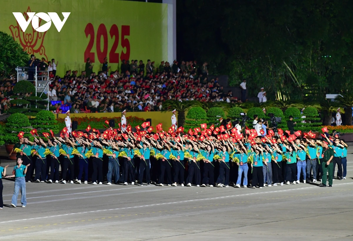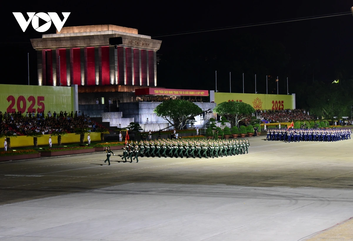 | Tối 21/8, các lực lượng tham gia diễu binh, diễu hành A80 lần đầu tổng hợp luyện trên Quảng trường Ba Đình. |