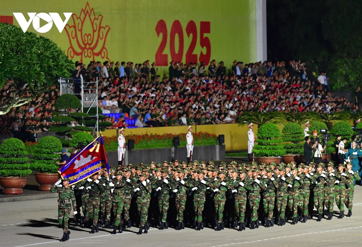 | Buổi tổng hợp luyện tối 21/8 còn có sự góp mặt của 3 khối quân đội nước ngoài. Trong số này, dẫn đầu là khối quân nhân Nga. |