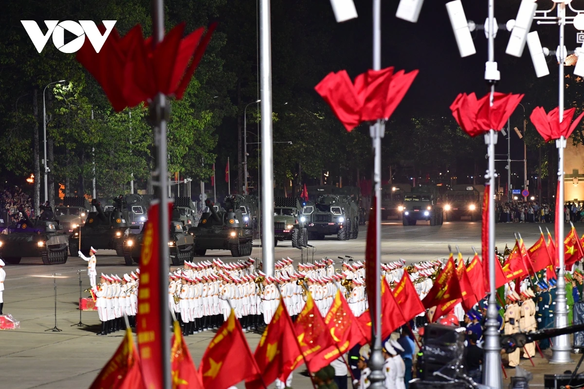 | 14 khối xe pháo quân sự, đặc chủng của Quân đội và Công an nối nhau tiến vào Quảng trường Ba Đình theo đường Hùng Vương, tạo nên khung cảnh hùng tráng. |