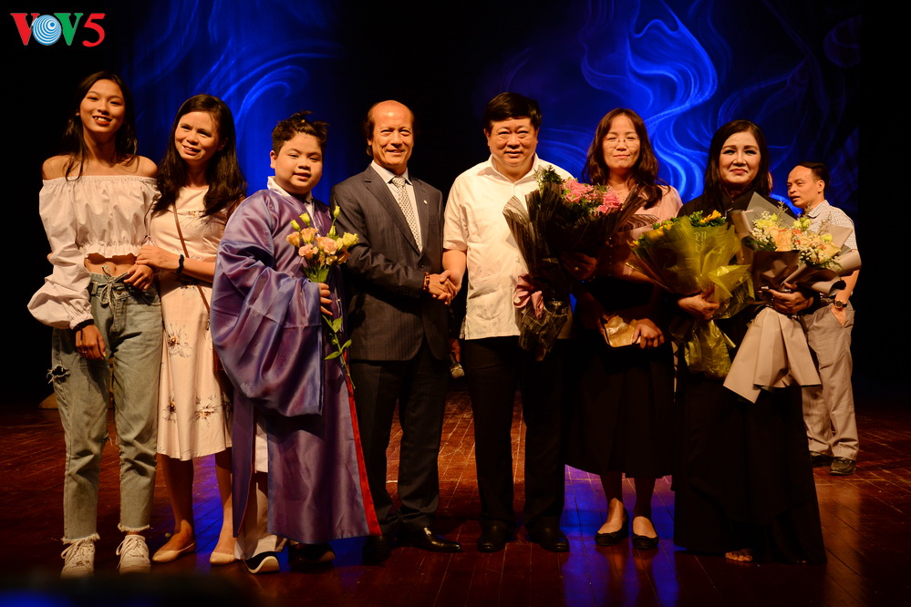 | GS.TS Nguyễn Xuân Thắng và PGS.TS Nguyễn Thế Kỷ cùng các khách mời lên sân khấu tặng hoa, chụp ảnh lưu niệm cùng các nghệ sĩ. |