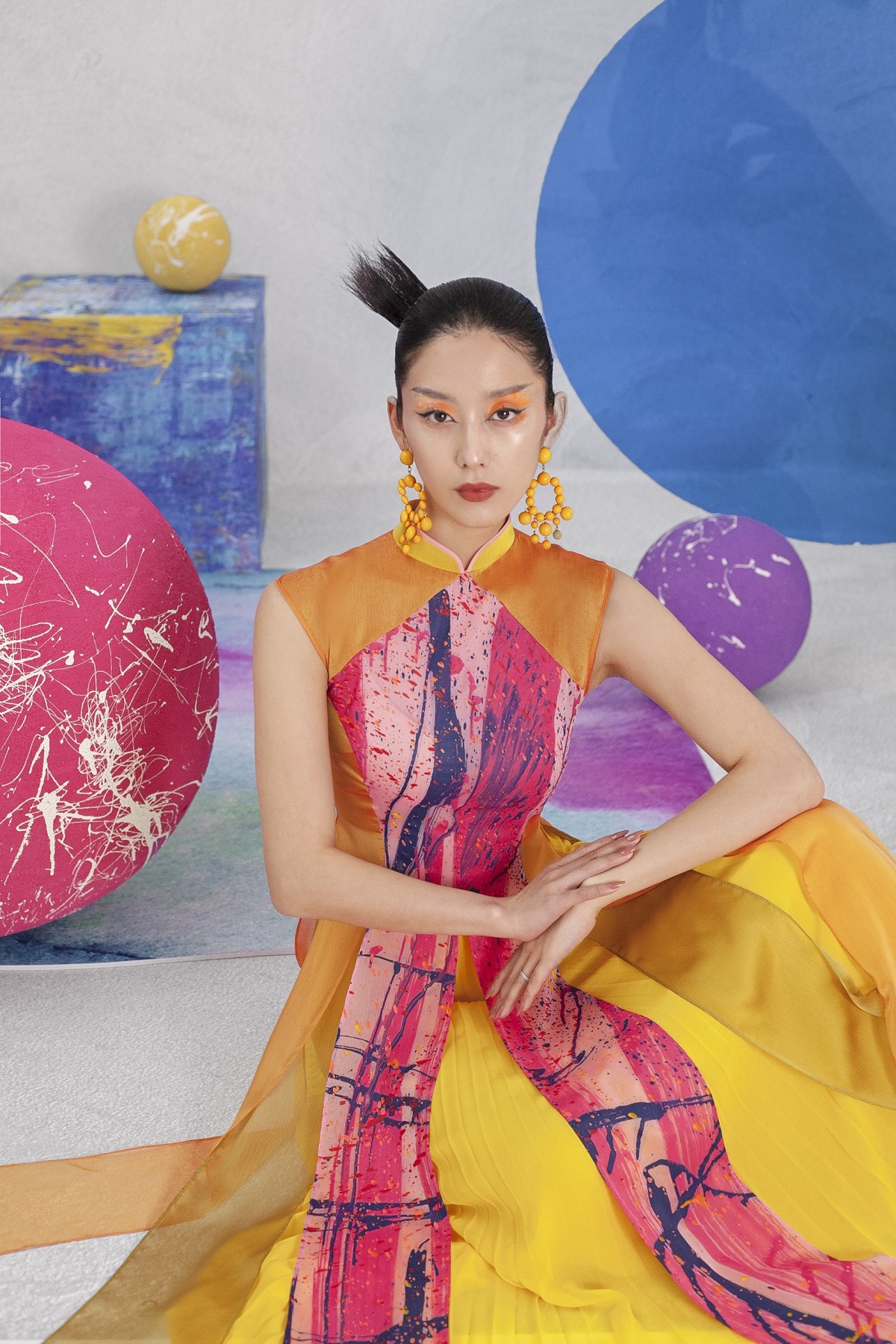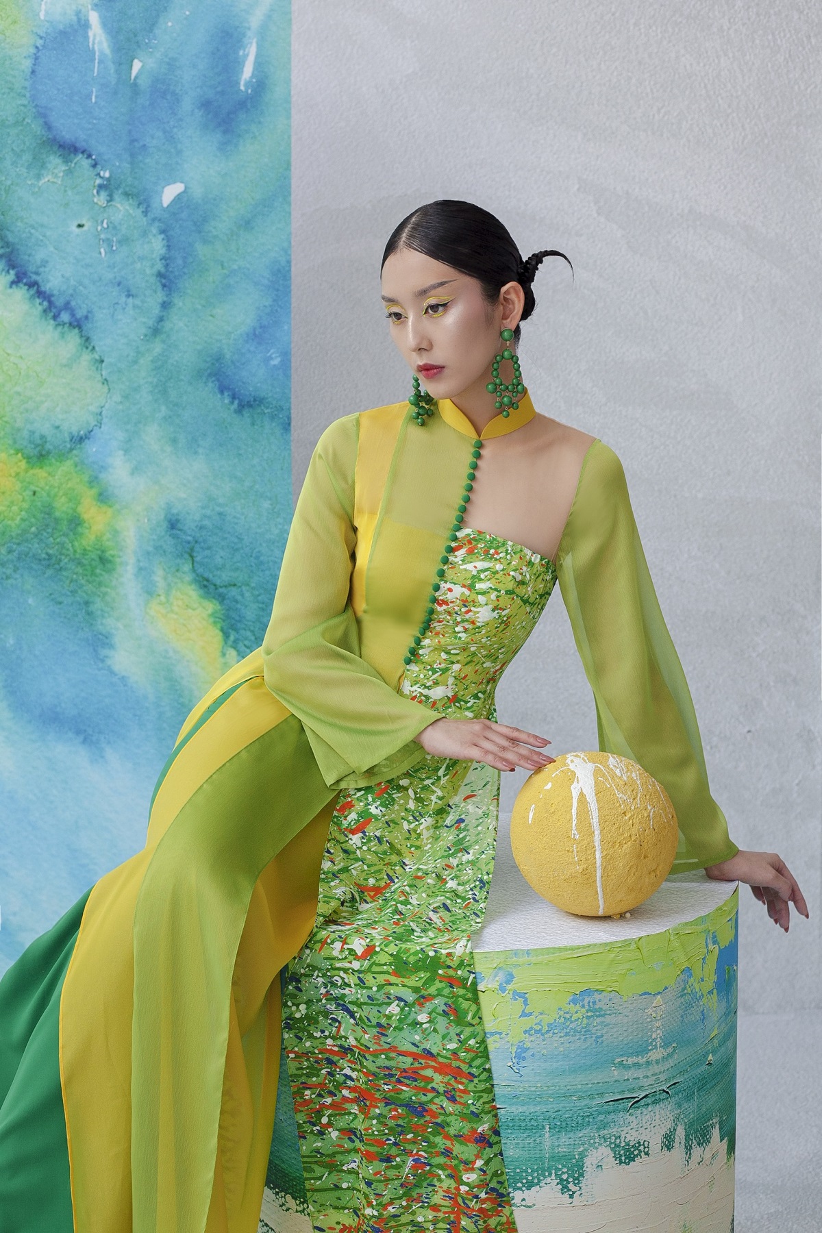 Kết hợp yếu tố hội họa trong thời trang, NTK Kenny Thái mang đến vẻ trẻ trung, mới mẻ cho BST áo dài 'Khai sắc'. |