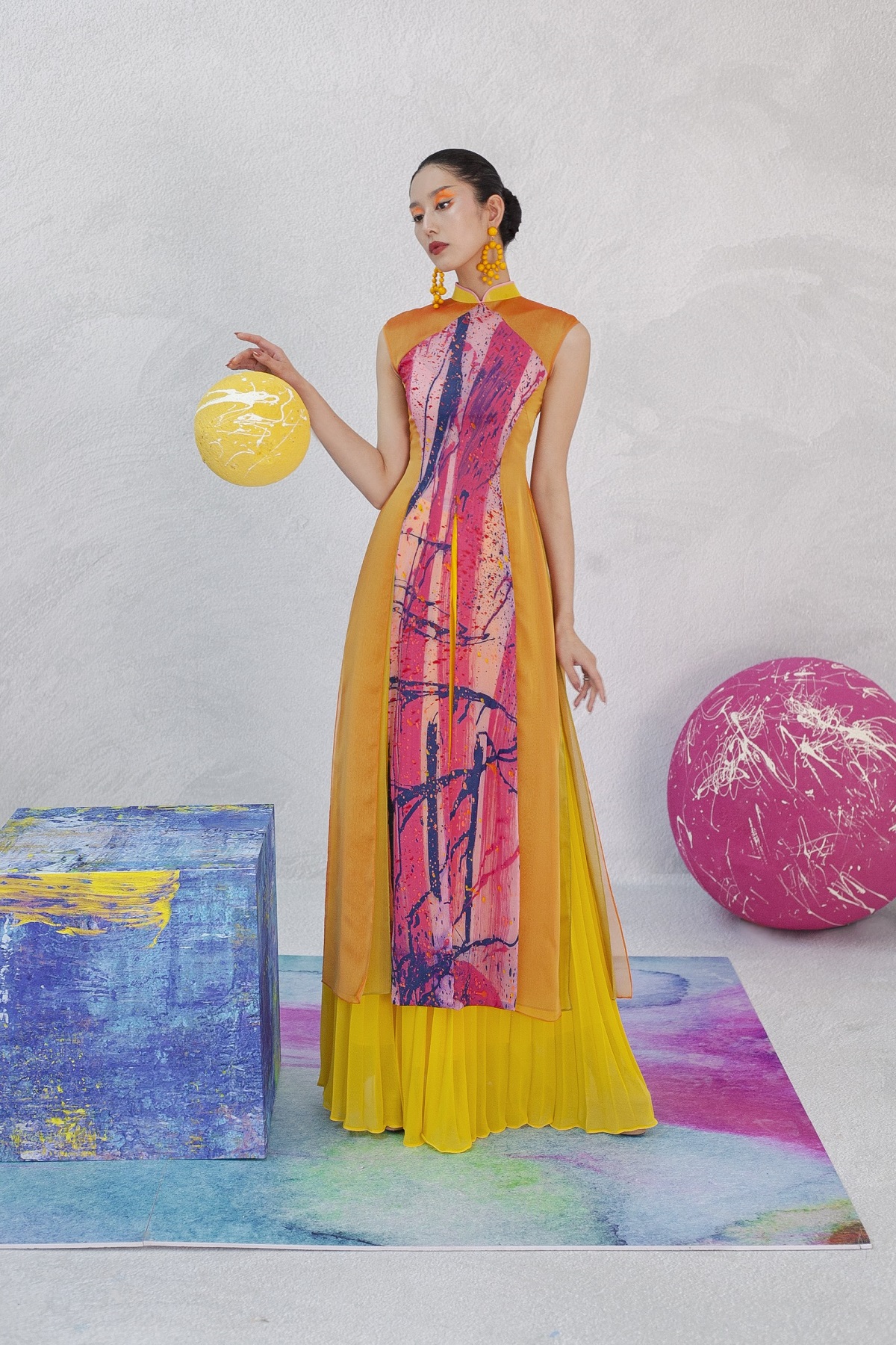 Độ ngẫu hứng của màu và tính bay bổng của tơ, sáng bừng chất riêng, ghi dấu mối kỳ duyên giữa áo dài và hội hoạ. |