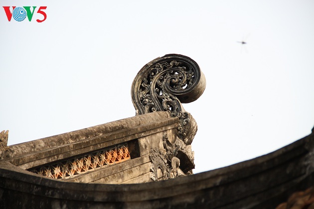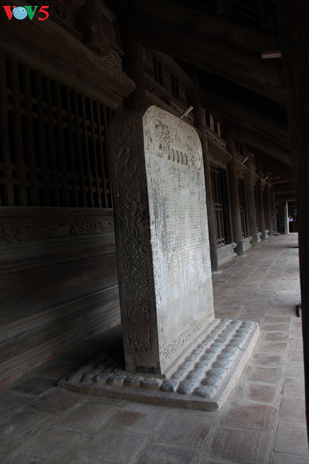 | Tấm bia đá điển hình về mỹ thuật thời Lê trung hưng đặt ở trước hiên Tiền đường. |