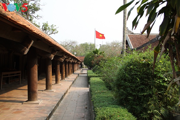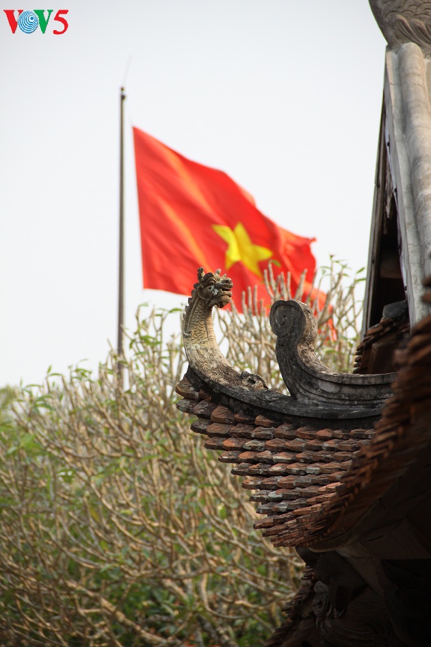 | Từ trên đê sông Hồng nhìn xuống, tam quan ngoại ẩn mình dưới bóng lá sum suê của cây đa cổ thụ tạo sự gần gũi. |