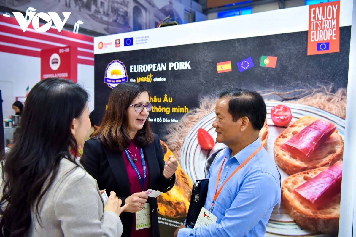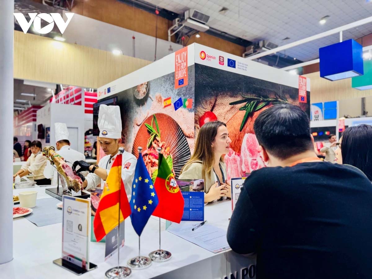 | Tại gian hàng châu Âu, du khách được thưởng thức món đùi heo muối serrano đặc trưng của Tây Ban Nha. Các đầu bếp chuyên nghiệp còn trình diễn những món ăn sáng tạo, kết hợp giữa hương vị châu Âu và ẩm thực Việt Nam. |