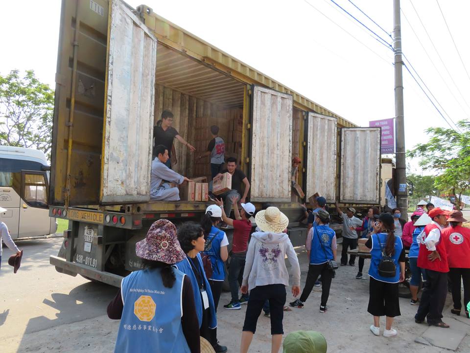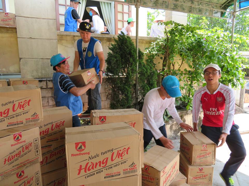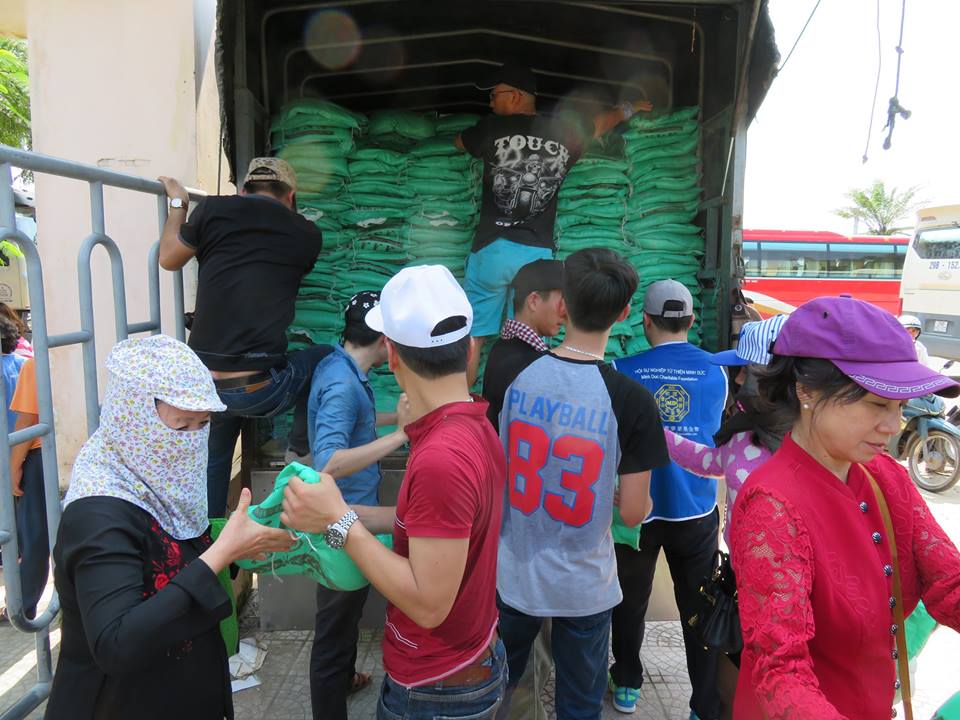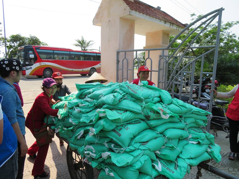 | Tình nguyện viên chuyển gạo và mì từ xe ô tô về nơi tập kết |