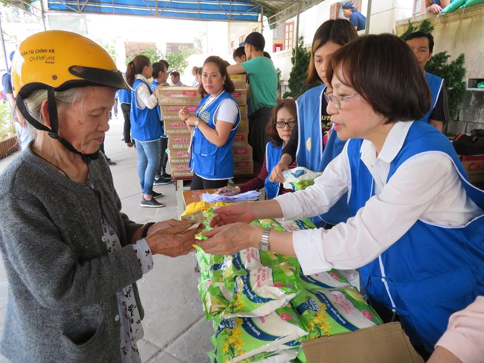 Quà tặng cho người nghèo gồm: gạo, mỳ gói, dầu ăn, nước tương, tiền, ...