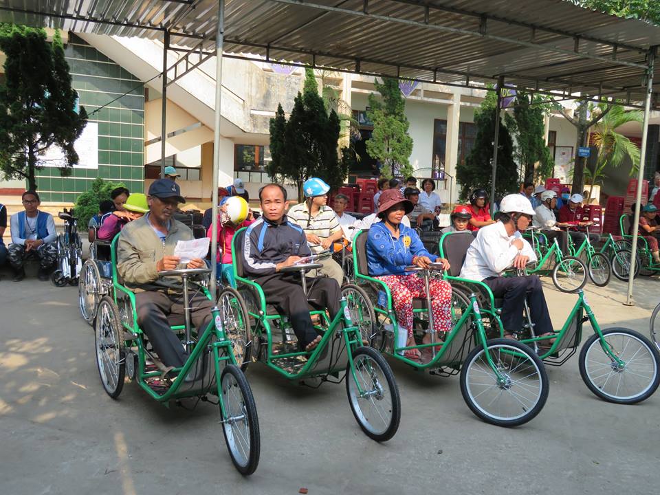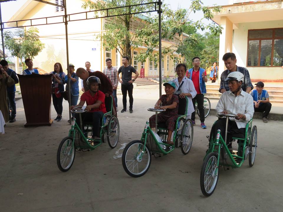 Không chỉ tặng xe lắc, xe lăn cho người khuyết tật, tình nguyện viên còn hướng dẫn người dân sử dụng ngay tại sân trường.