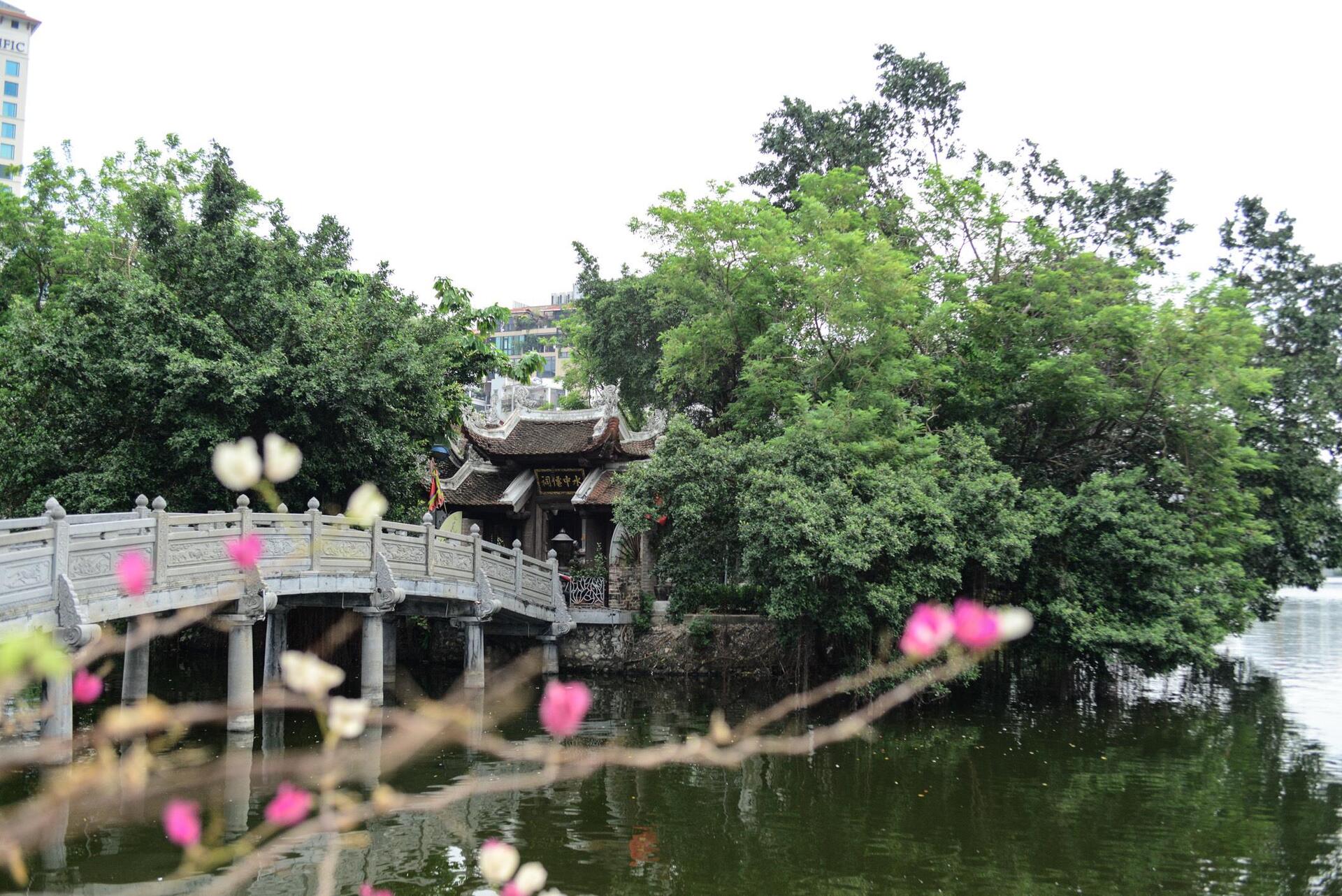 | Không gian yên bình tại đền Thủy Trung Tiên bên cạnh hồ Trúc Bạch. |