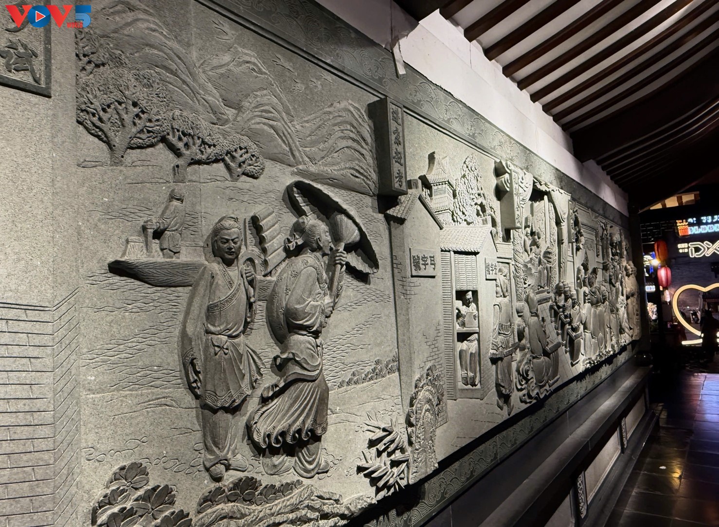 Bức tranh tường, chạm khắc trên đá tái hiện cảnh thi cử triều đình xưa.