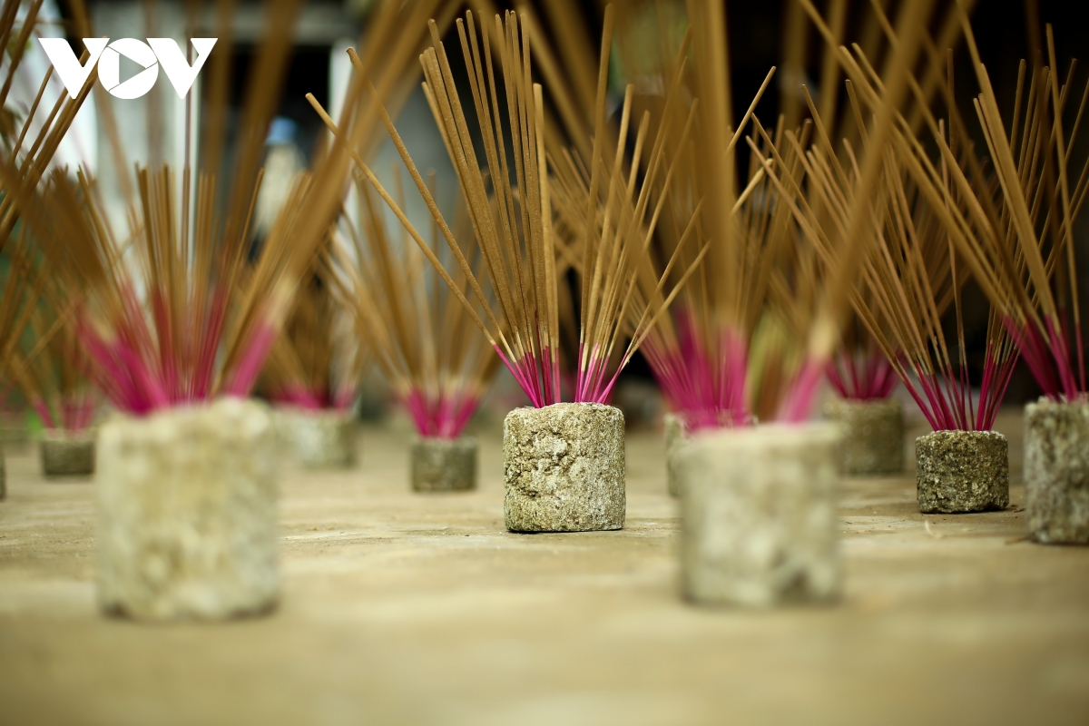 Những que hương sau đó sẽ được nhuộm chân màu đỏ rồi đem phơi khô tiếp, sau cùng là buộc thành từng bó để đi bán.