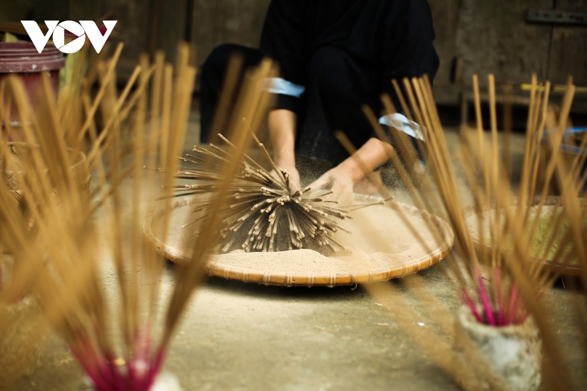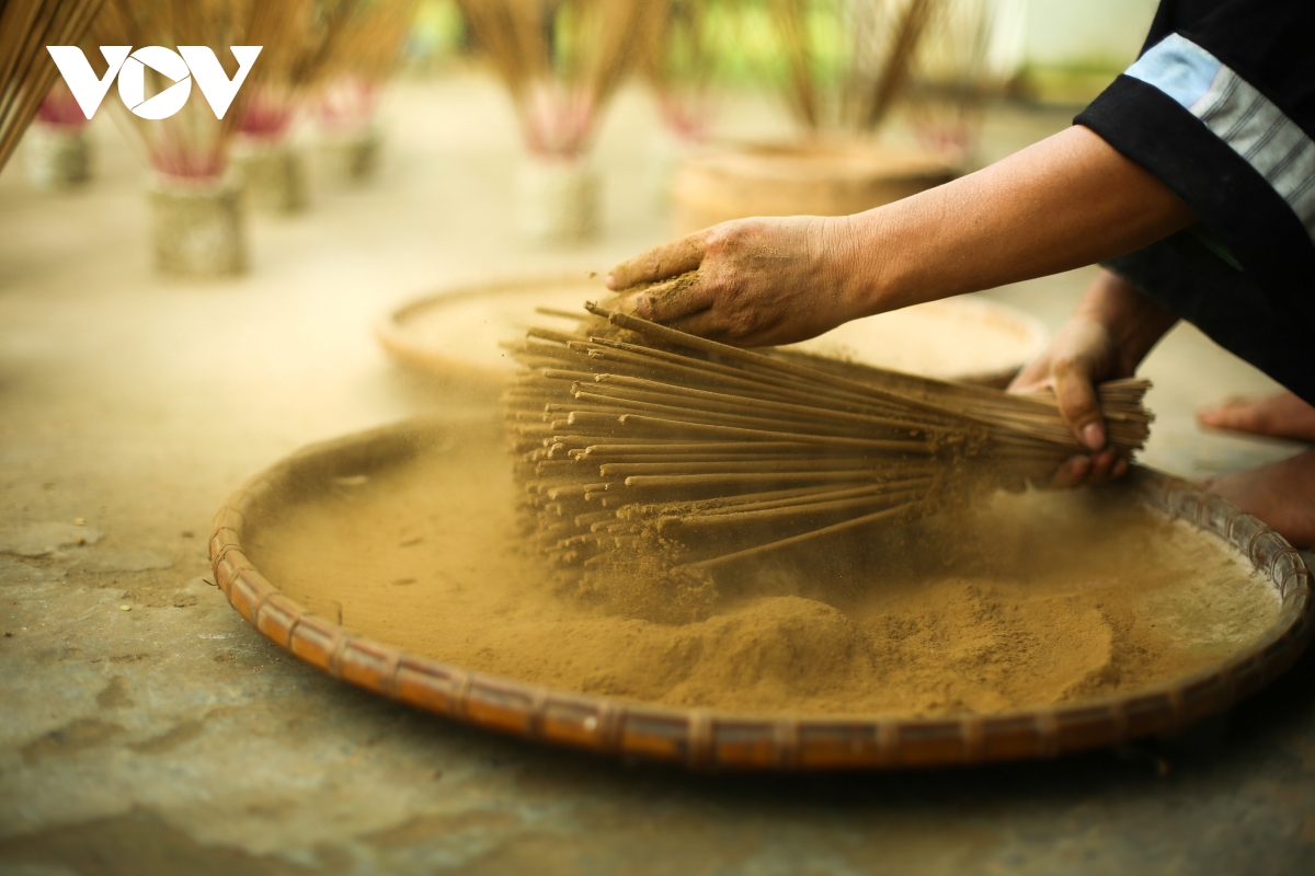 Nhúng hương vào nước keo rồi tẩm với hỗn hợp gồm mùn cưa và bột trầm, cứ làm đi làm lại 4 lần để cho ra được một que hương chắc và đẹp.