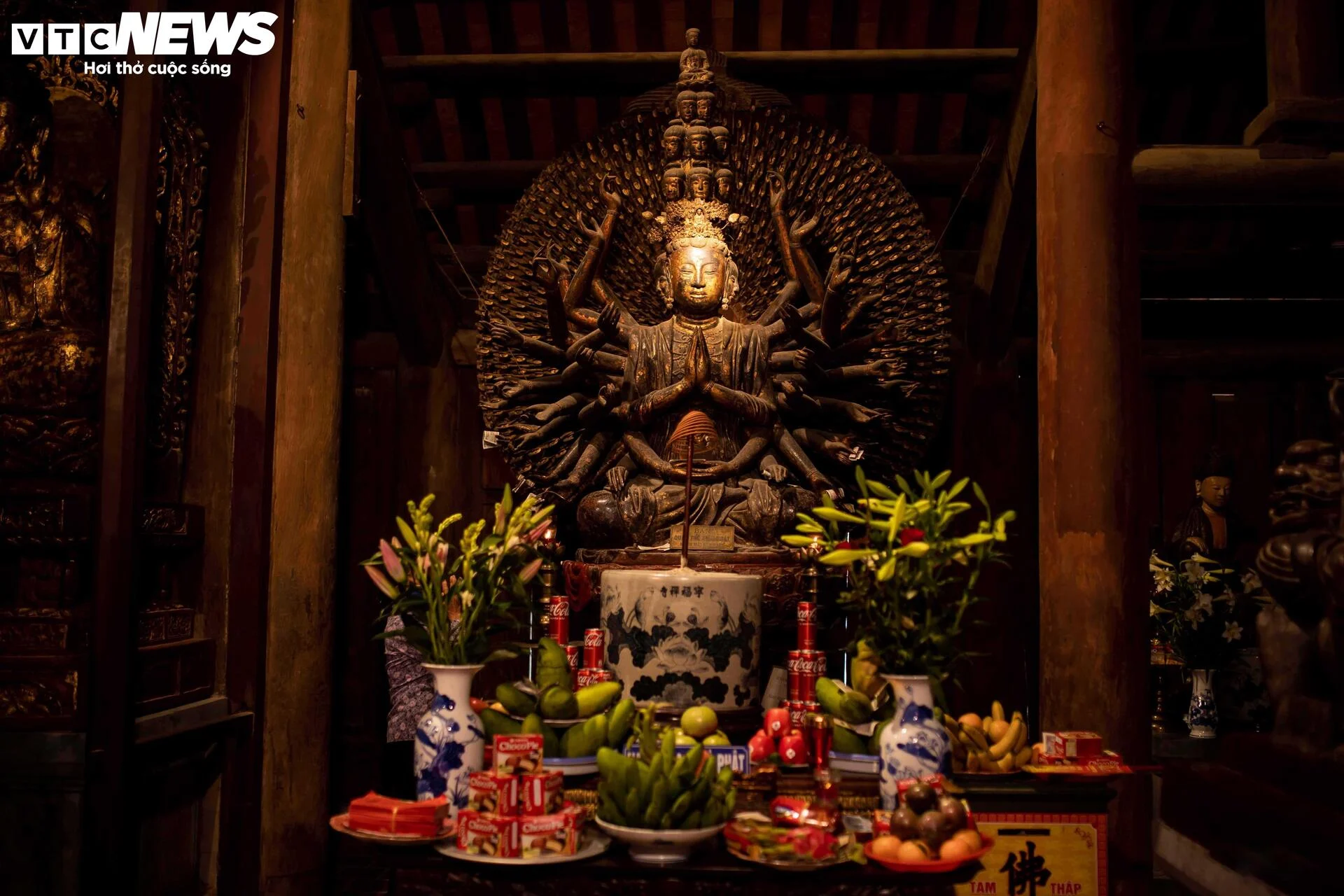| Tượng Phật Bà Quan Âm nghìn mắt nghìn tay được các nhà nghiên cứu đánh giá là một kiệt tác, một đỉnh cao của nghệ thuật tạc tượng trong thời kỳ Lê Trung Hưng. Tượng được làm từ chất liệu gỗ phủ sơn, cao 235 cm, thể hiện sự công phu và tài hoa của người nghệ nhân. |