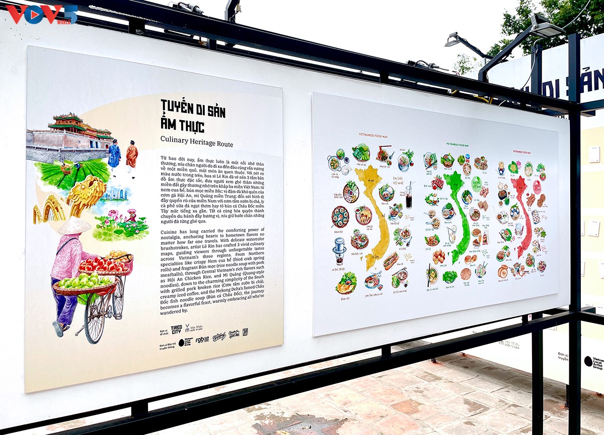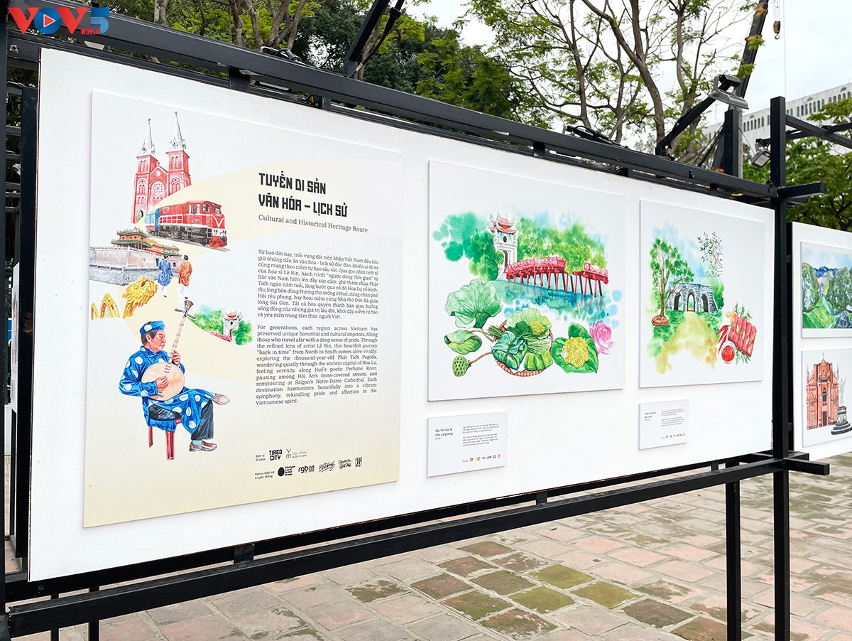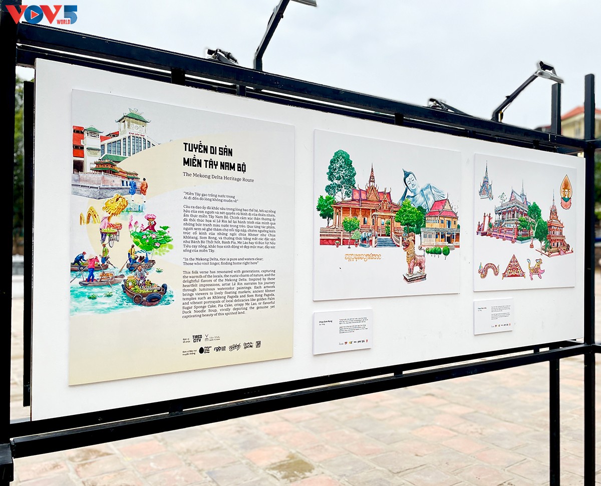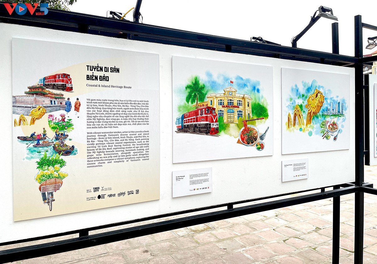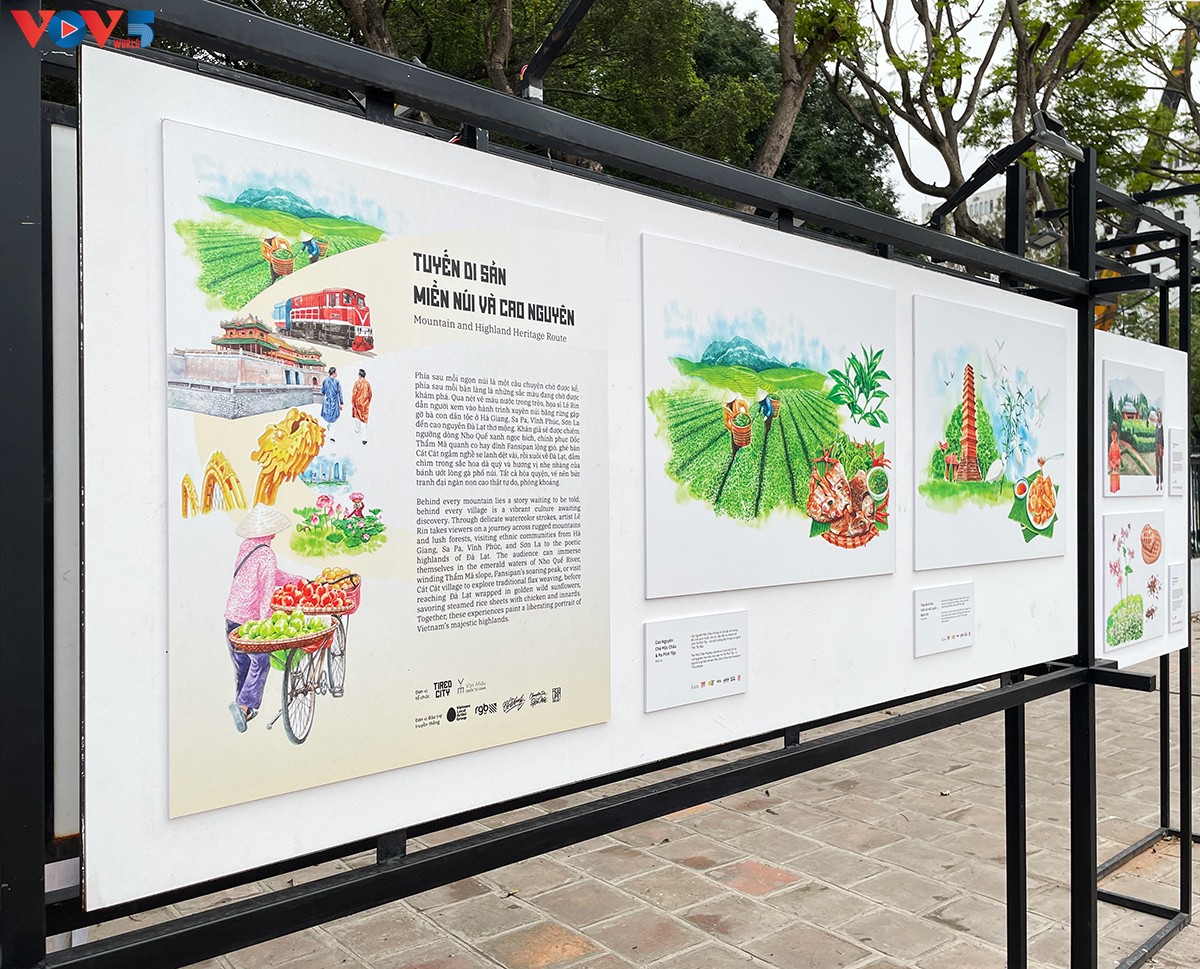 | Đến với triển lãm du khách sẽ được đắm chìm vào những cảnh đẹp, những món ăn, những câu chuyện về di sản của từng vùng thông qua 5 trạm, nơi họa sĩ Lê Rin đã có những trải nghiệm thực tế tại đó và phác họa ra được những bức tranh màu sắc và vô cùng sinh động. |