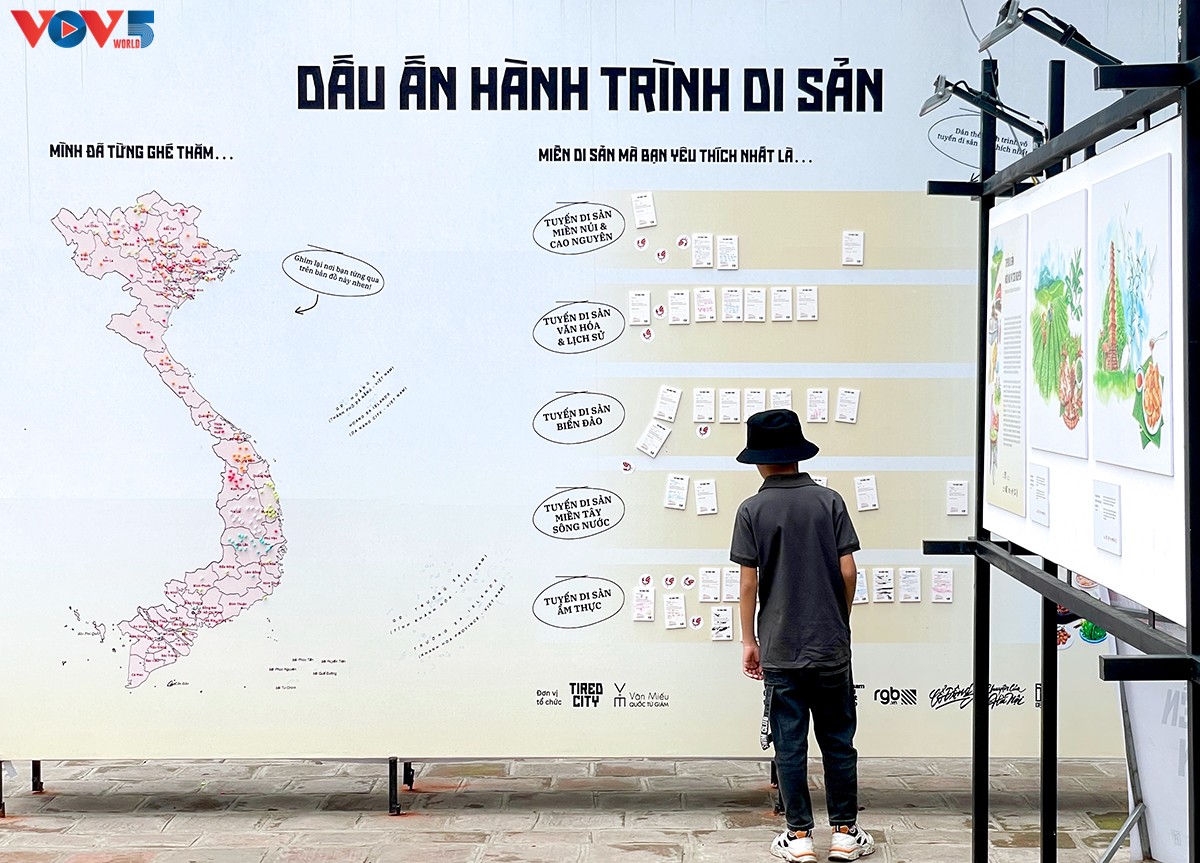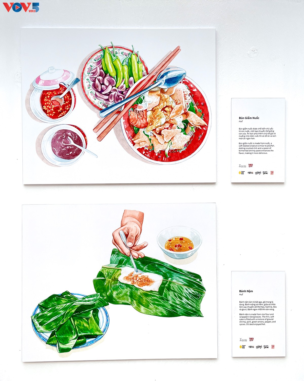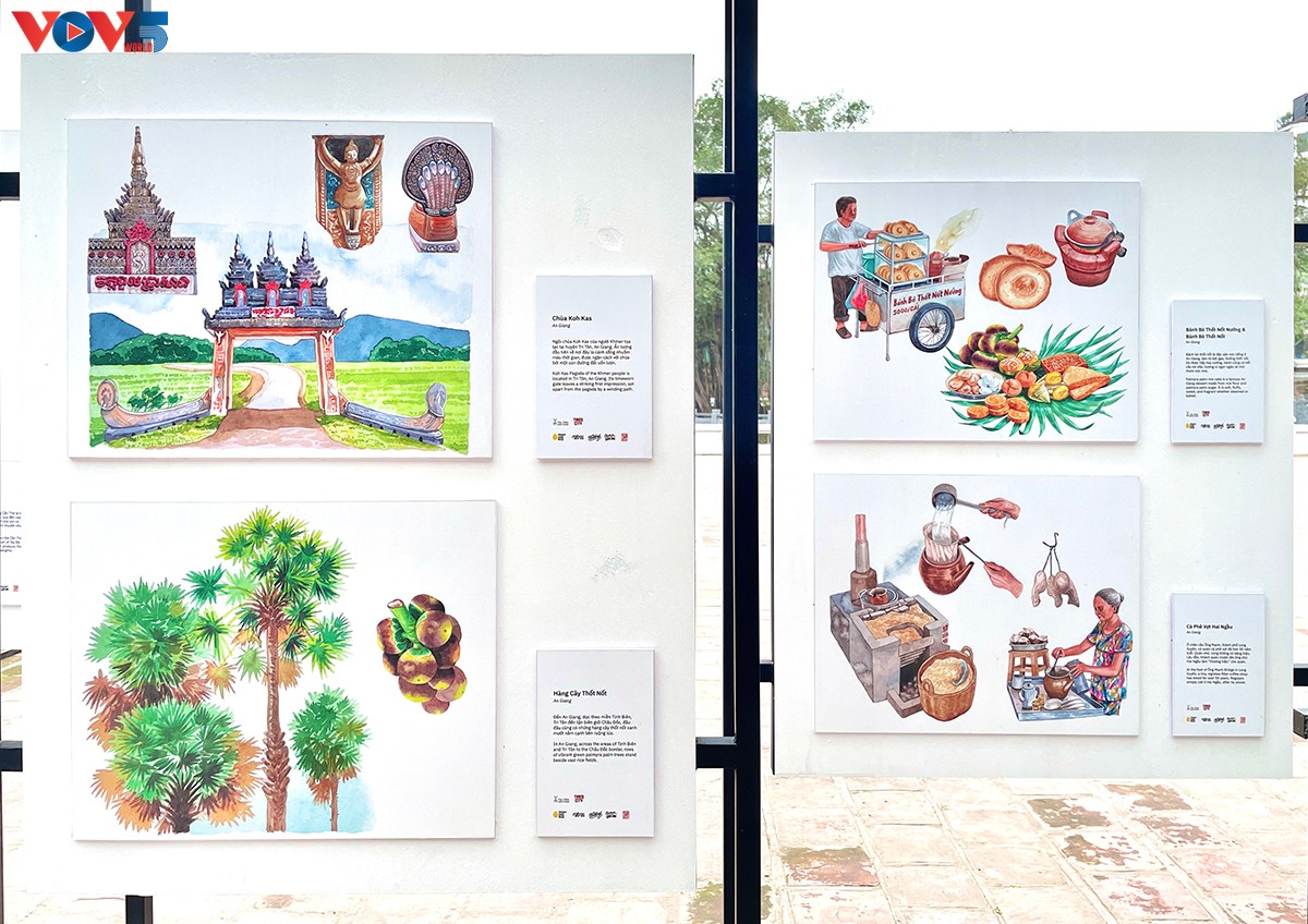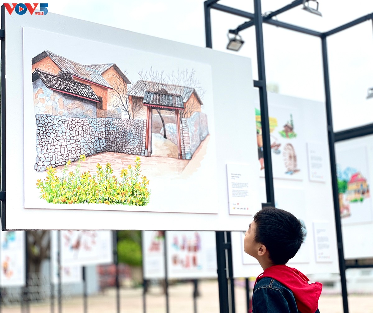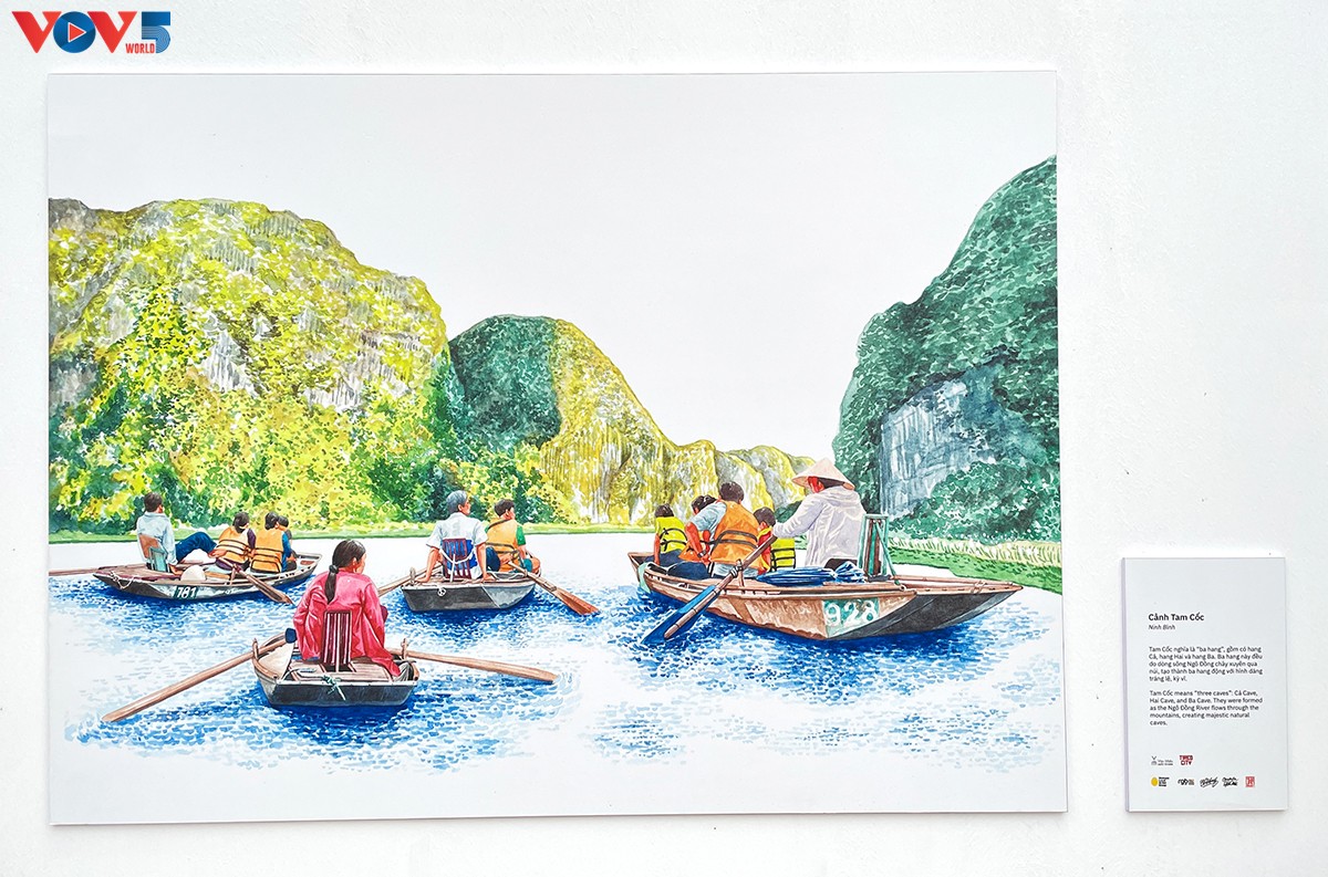 | Đến với triển lãm du khách sẽ được đắm chìm vào những cảnh đẹp, những món ăn, những câu chuyện về di sản của từng vùng thông qua 5 trạm, nơi họa sĩ Lê Rin đã có những trải nghiệm thực tế tại đó và phác họa ra được những bức tranh màu sắc và vô cùng sinh động. |