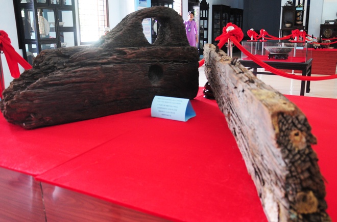 Bánh lái và một phần mảnh gỗ từ con tàu đắm ở vùng biển Cù Lao Chàm. Thạc sĩ Nguyễn Tuấn Lâm, chuyên gia khảo cổ học dưới nước cho biết, con tàu còn khá nguyên vẹn chở lô hàng gốm sứ (niên đại khoảng thế kỷ 15) đi ngang qua vùng biển này gặp nạn chìm ở độ sâu 72 m.